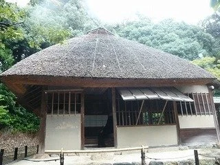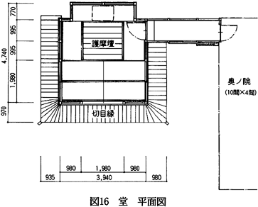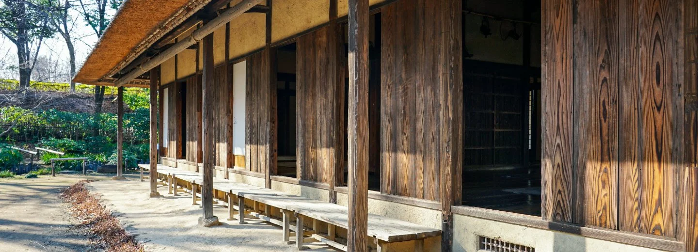 The image below shows the façade organisation of a gable-entry (tsuma-iri 妻入り) farmhouse in the Nose (能勢) district, О̄saka Prefecture. The utilitarian entrance door (о̄-do 大戸) is on the left, and to its right is the formal genkan entrance, with board floor (shiki-dai 式台), opaque timber lattice panels (maira-do 舞良戸) and papered timber lattice sliding panels (shо̄ji 障子). To the right of the genkan, extending perpendicularly out from the facade, are the garden wall and garden gate (niwa-chūmon 庭中門), on the other side of which is the guest room (kami-zashiki 上座敷) which faces onto the garden (tei-en 庭園). This arrangement is representative of mid-scale farmhouses (chū-nо̄-ka 中農家) in the Kinki region.