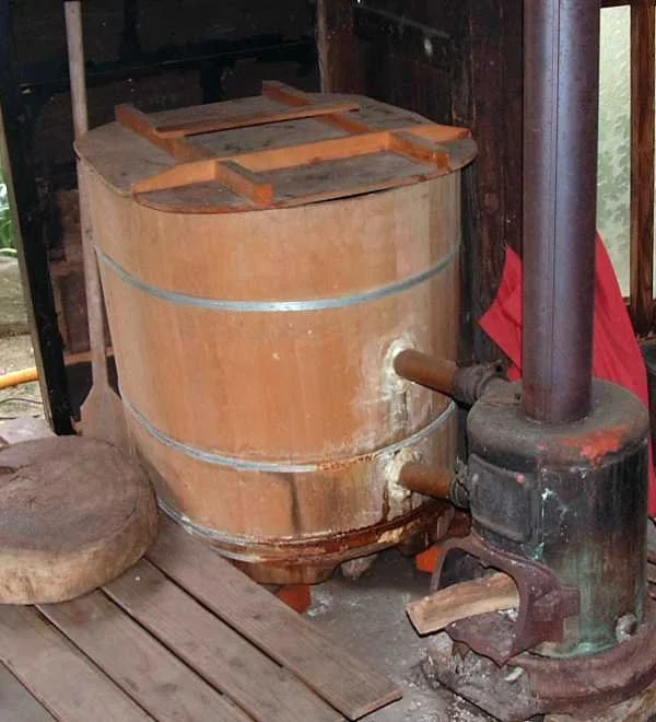 In places like the islands of Amami (奄美) and Hachijou (八丈), where the raised-floor style (taka-yuka keishiki 高床形式) houses have no earth-floored utility area (doma 土間), the exterior ‘verandah’ (gai-en 縁) becomes the entrance, and footwear is kept under it, or in the shelter of the ‘windbreak’ (kaze-yoke) 風除け where the gai-en turns a corner. In more recent times, however, you could also find houses of this type with a simple kind of genkan-gamae, where part of the under-eaves space (geya 下屋) was made into a doma, and equipped with a shо̄ji door (shо̄ji-do 障子戸) of vertical-batten construction (tate-zan-gumi 竪桟組), called a kо̄shi-do (格子戸, ‘lattice door’). Kо̄shi, more commonly encountered as the characteristic vertical timber ‘grilles’ fixed over the facade windows of townhouses (machiya 町家), are of more robust construction and more closely spaced than the latticework of shо̄ji, and are intended to provide security and some privacy to the people and goods within. Kо̄shi-do style (kо̄shi-do keishiki 格子戸形式) doors are common at the entrances of machiya in all Japan’s regions, but о̄-do with moguri are also used. Machiya as a rule have narrow frontages, so instead of a single-leaf sliding (kata-biki 片引き) door that requires the room behind it to be double its width for it to fully open, it is common to find top-hung doors that are swung inward and upward and held open on iron hooks suspended from the ceiling, or side-hung hinged (chо̄-tsugai-dzuri or chо̄-ban-dzuri蝶番吊り) doors that swing inwards against the side wall.