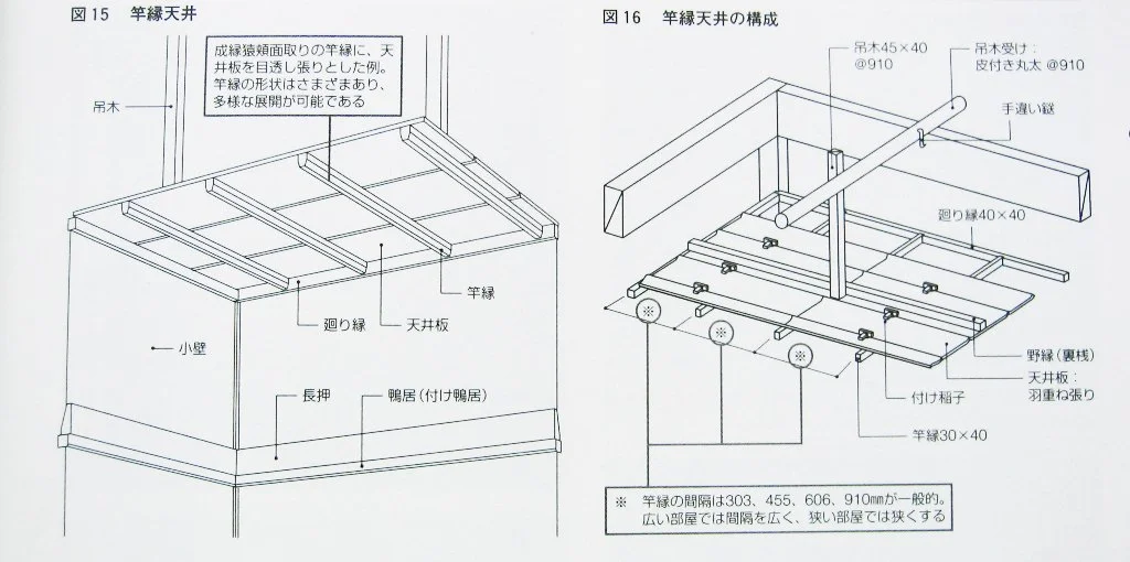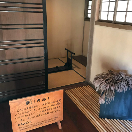 The о̄-do-guchi entry (大戸口, lit. ‘big door mouth’), which corresponds to the everyday entry and exit, is a robust о̄-do (大戸 ‘big door’), usually sliding, of about one ken (1.81m) in width. Because these doors are heavy and inconvenient to open and close, they were left open during the day, when the entrance was covered with a light ‘high-waist shо̄ji’ (koshi-daka shо̄ji 腰高障子), a sliding door consisting of a boarded lower half and papered lattice upper half. For entry and exit at night when the о̄-do was drawn over the opening, there was the moguri (潜り, lit. ‘diver’), a ‘door within a door’ installed in part of the о̄-do. The image below shows such an arrangement: during the day, the two koshi-daka shо̄ji are drawn over the opening; at night they are drawn back, and the о̄-do is drawn. The unusually high sill on this moguri, requiring one to ‘straddle enter’ (mataide-hairu 跨いで入る), is an old style, intended to discourage uninvited intrusion. Additionally, around the mid rail of the moguri, on the о̄-do side, there is a kururu (くるる) locking mechanism consisting of a small top-hung block and latch that prevents the moguri door from being opened. The horizontal battens on the left, attached to the face of the wall flanking the entrance (to-guchi 戸口), form a ‘scratch climb’ (kaki-nobori 掻き上り) ladder (hashigo 梯子) that leads to the servants’ room (shiyou-jin shitsu 使用人室) above the shimo-mise (しもみせ ‘lower shop’) that lies beyond the wall and door at the far left of the image.