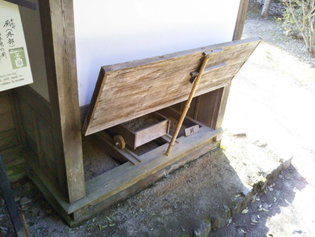 A moguri-do (潜り戸) with three ‘pulls’ (hikite 引手) whose use is differentiated according to class status. Horiuchi family (Horiuchi-ke 堀内家) residence, Nagano Prefecture.