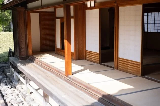 In Yamato (大和) and part of Kawachi (河内), there are areas in which one ken wide (1.81m) sliding shо̄ji, for daytime use, are installed on the exterior side of the о̄-do, as in image below. Though these double-wide shо̄ji are somewhat heavy and cumbersome to operate (traditional Japanese sliding fittings do not have rollers or wheels but simply slide in tracks cut into the sills, though the tracks can be waxed to reduce friction and wear), they are sturdy, and from a security standpoint there are favourable aspects to a door that cannot be opened easily.