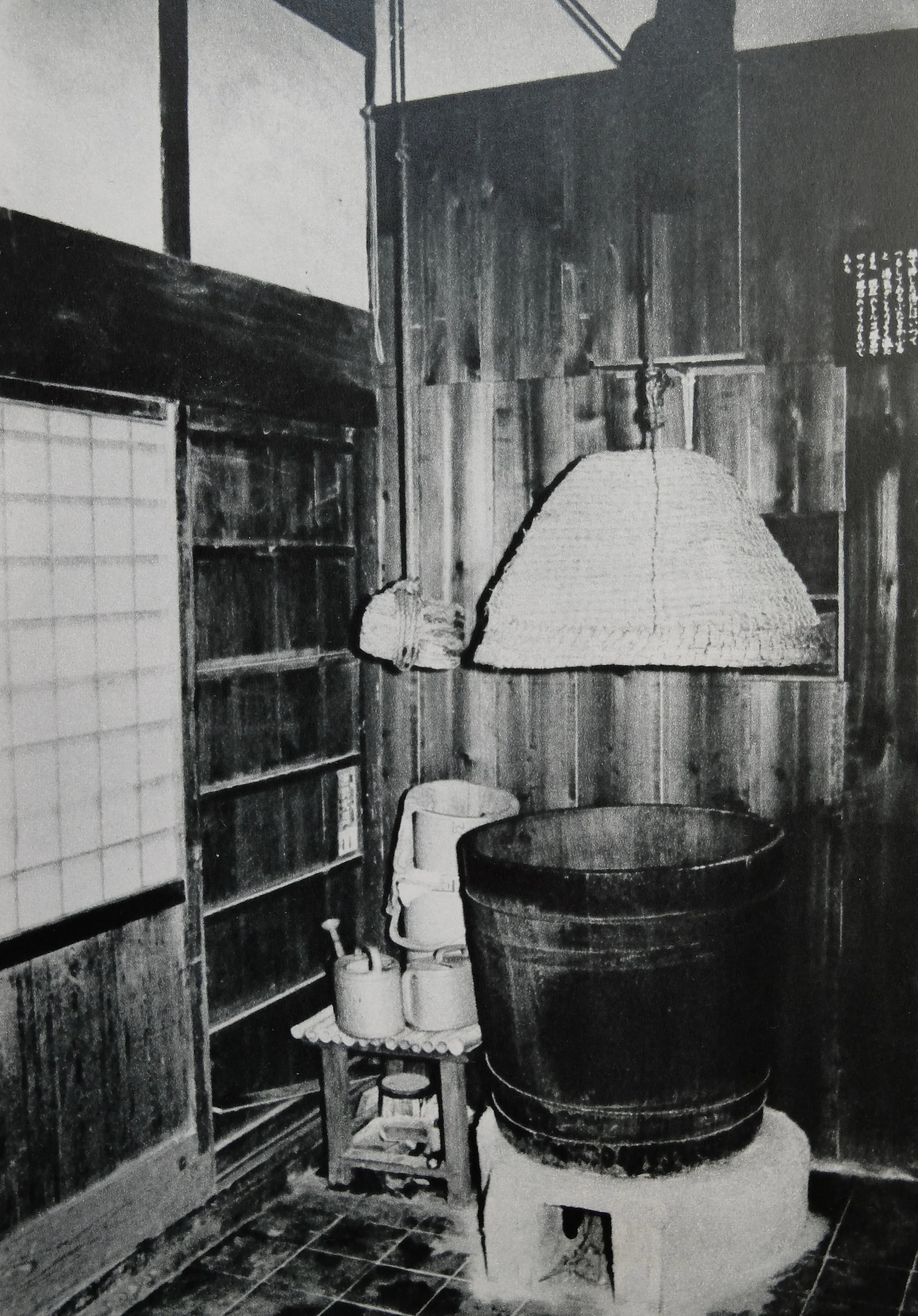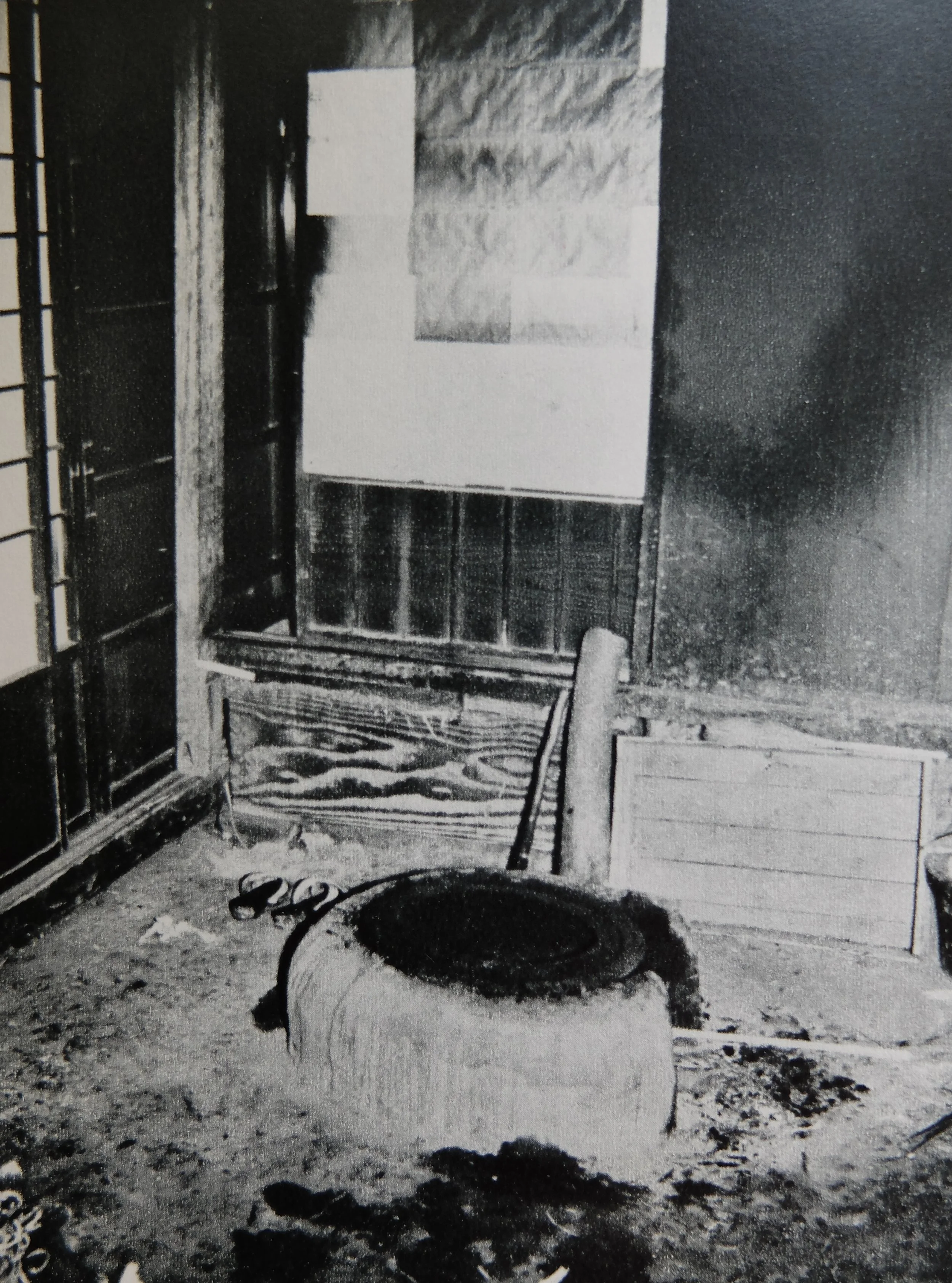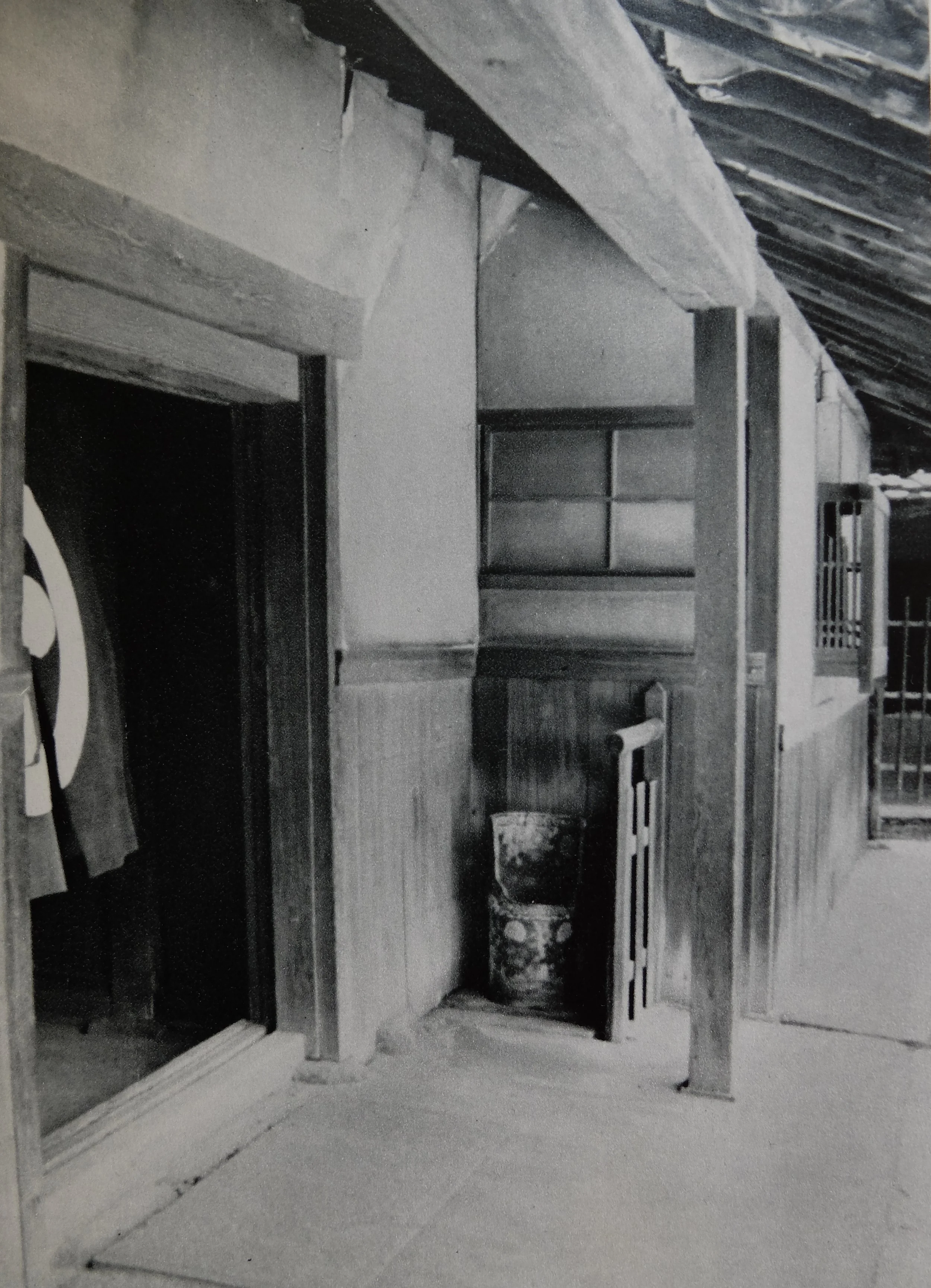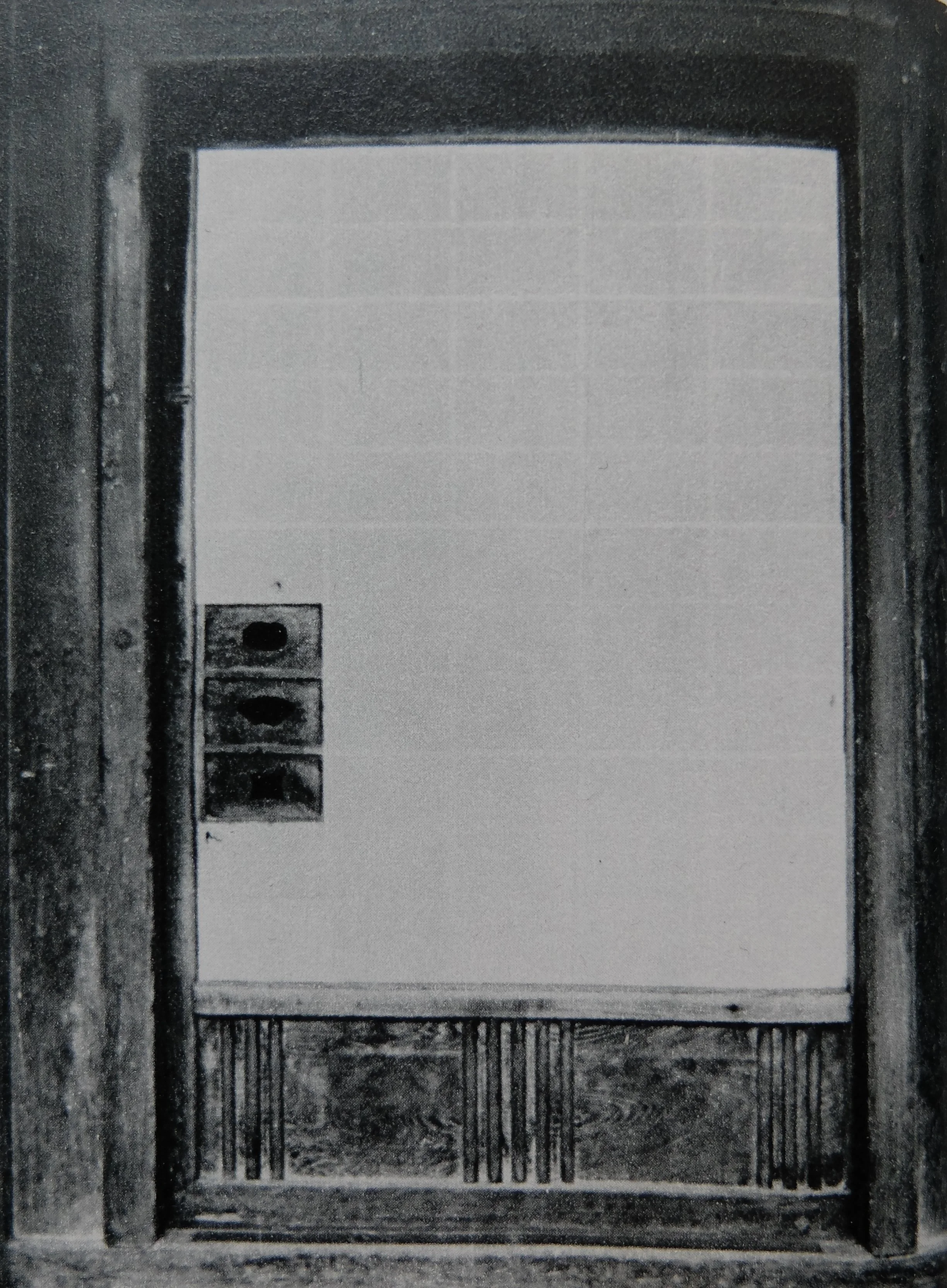 The image below shows the house of a village headman in Shiojiri (塩尻), Nagano Prefecture. It also has a genkan-gamae, but this one features a papered shо̄ji moguri in the о̄-do-guchi. The moguri-do (潜り戸, lit. ‘diving door’ or ‘ducking door’) has three handles or ‘pulls’ (hikite 引手) whose use is not determined according to whether one is a man, woman, or child, but by one’s feudal class status: the upper pull is for the landlord class (jinushi kaikyū 地主階級), the middle for farmers who owned and worked their own land, called takamochi byakushо̄ (高持百姓, ‘high hold commoner’) or ji-sakunо̄ (自作農, lit. ‘self make farming’), and the lower for tenant farmers (ko-sakunо̄ 小作農, lit. ‘small make farming’), day labourers and the like, called mizunomi byakushо̄ (水呑み百姓, lit. ‘water drinking commoner’). The lowest pull is the dirtiest, indicating that it was the most used.