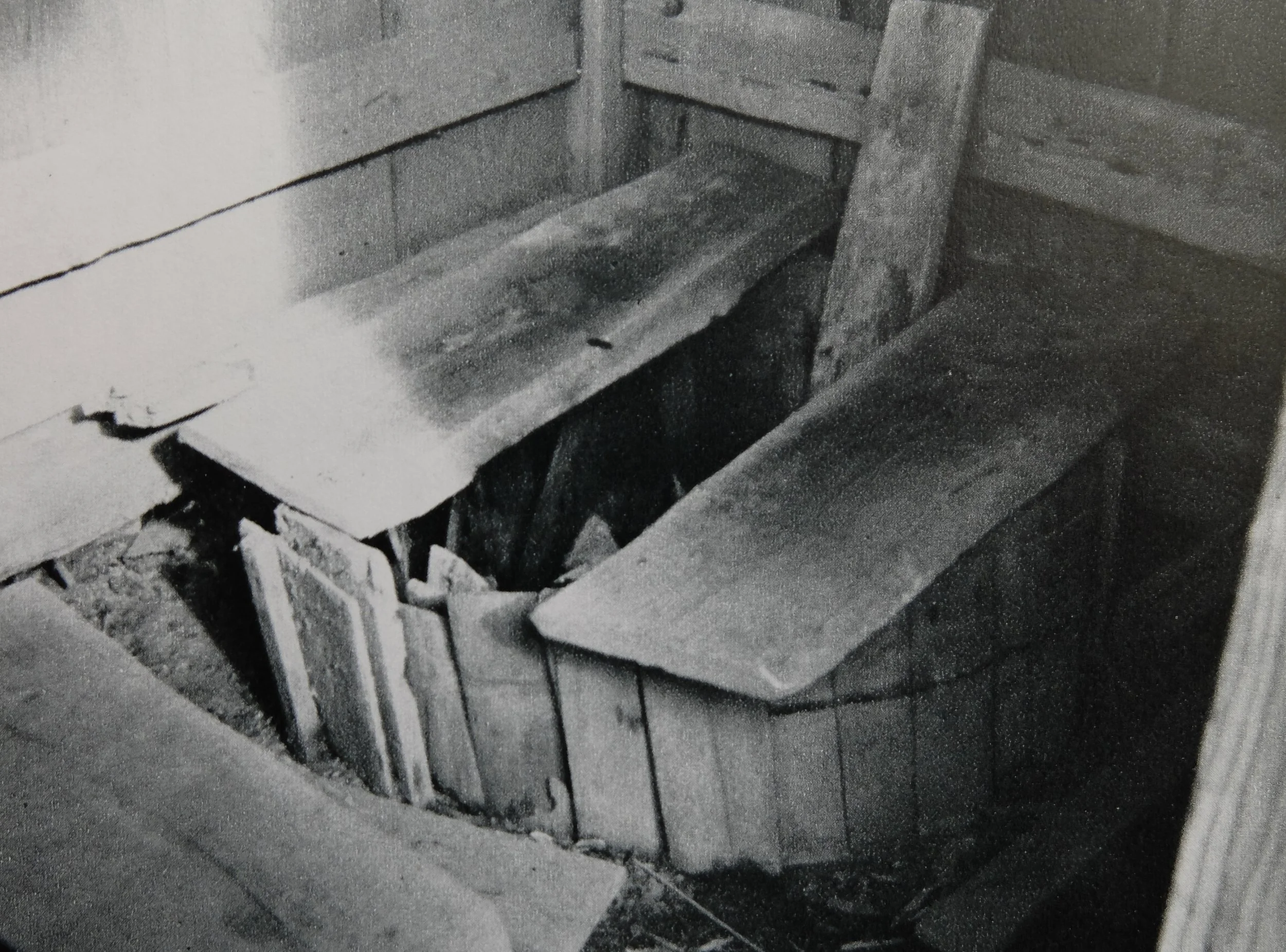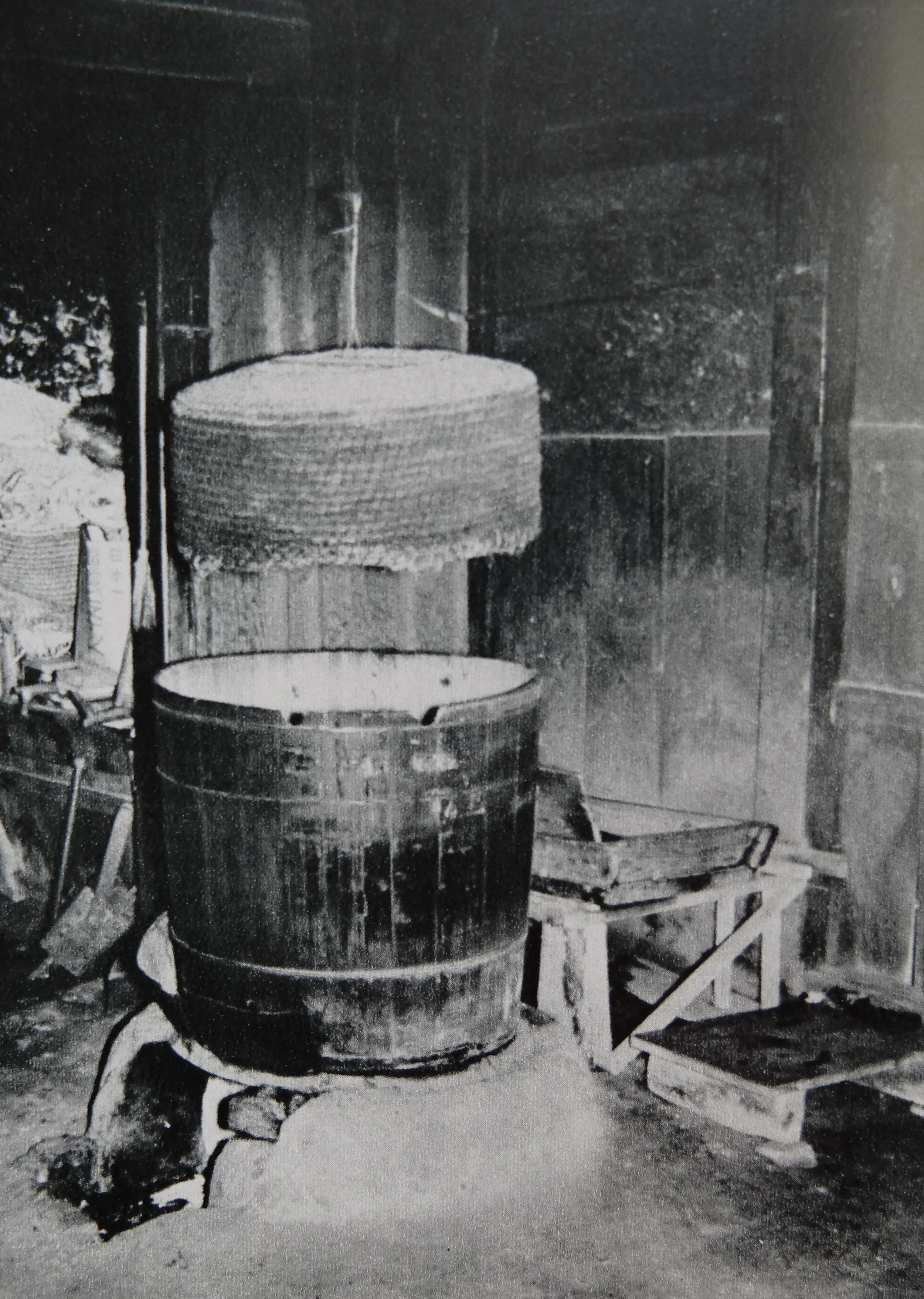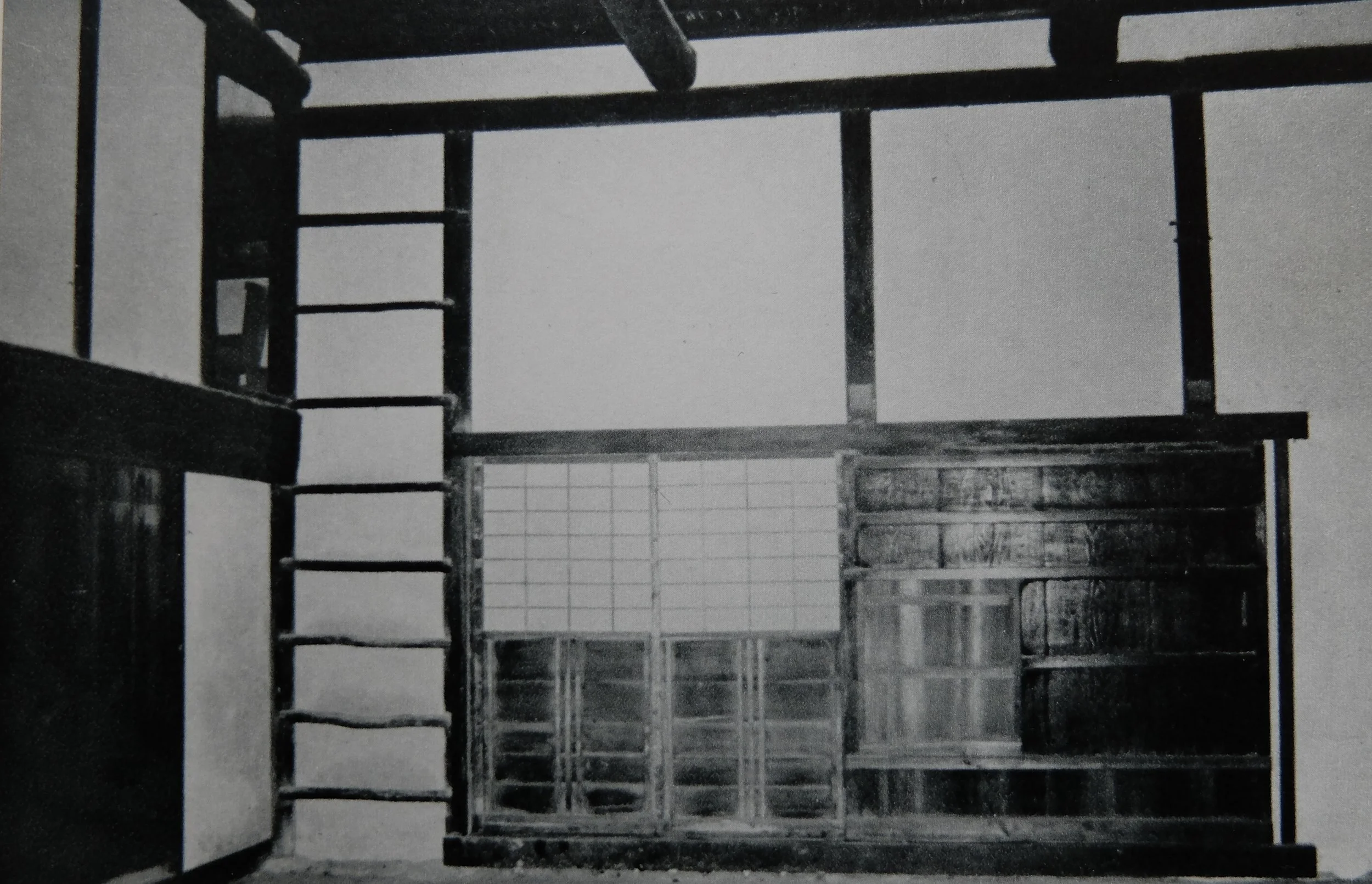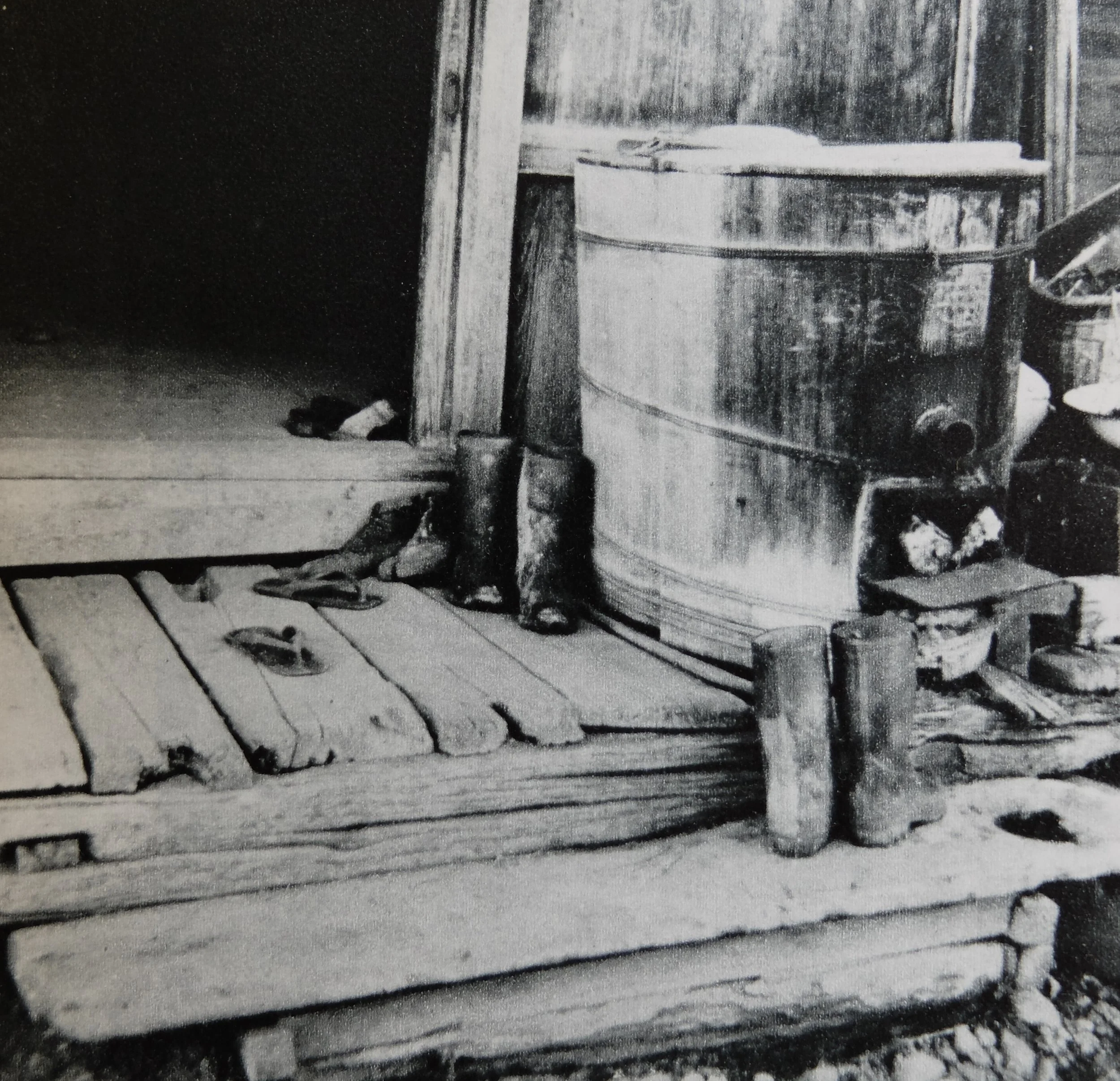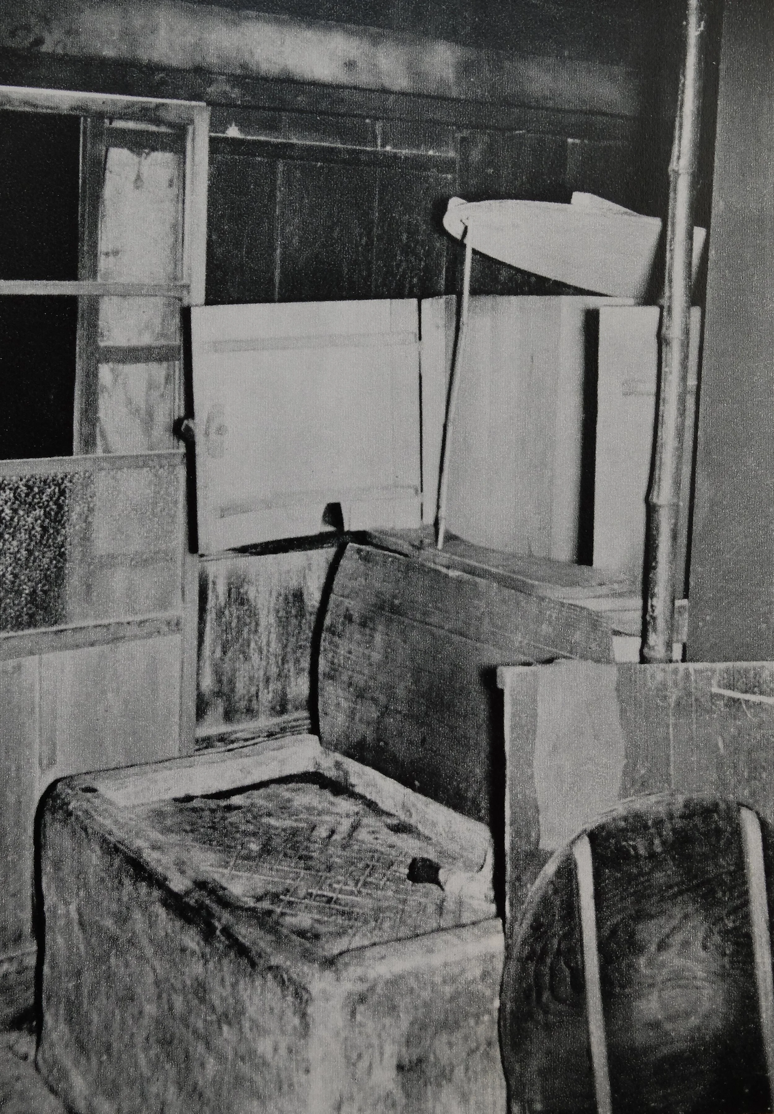 The image below shows the house of a village headman in Shiojiri (塩尻), Nagano Prefecture. It also has a genkan-gamae, but this one features a papered shо̄ji moguri in the о̄-do-guchi. The moguri-do (潜り戸, lit. ‘diving door’ or ‘ducking door’) has three handles or ‘pulls’ (hikite 引手) whose use is not determined according to whether one is a man, woman, or child, but by one’s feudal class status: the upper pull is for the landlord class (jinushi kaikyū 地主階級), the middle for farmers who owned and worked their own land, called takamochi byakushо̄ (高持百姓, ‘high hold commoner’) or ji-sakunо̄ (自作農, lit. ‘self make farming’), and the lower for tenant farmers (ko-sakunо̄ 小作農, lit. ‘small make farming’), day labourers and the like, called mizunomi byakushо̄ (水呑み百姓, lit. ‘water drinking commoner’). The lowest pull is the dirtiest, indicating that it was the most used.