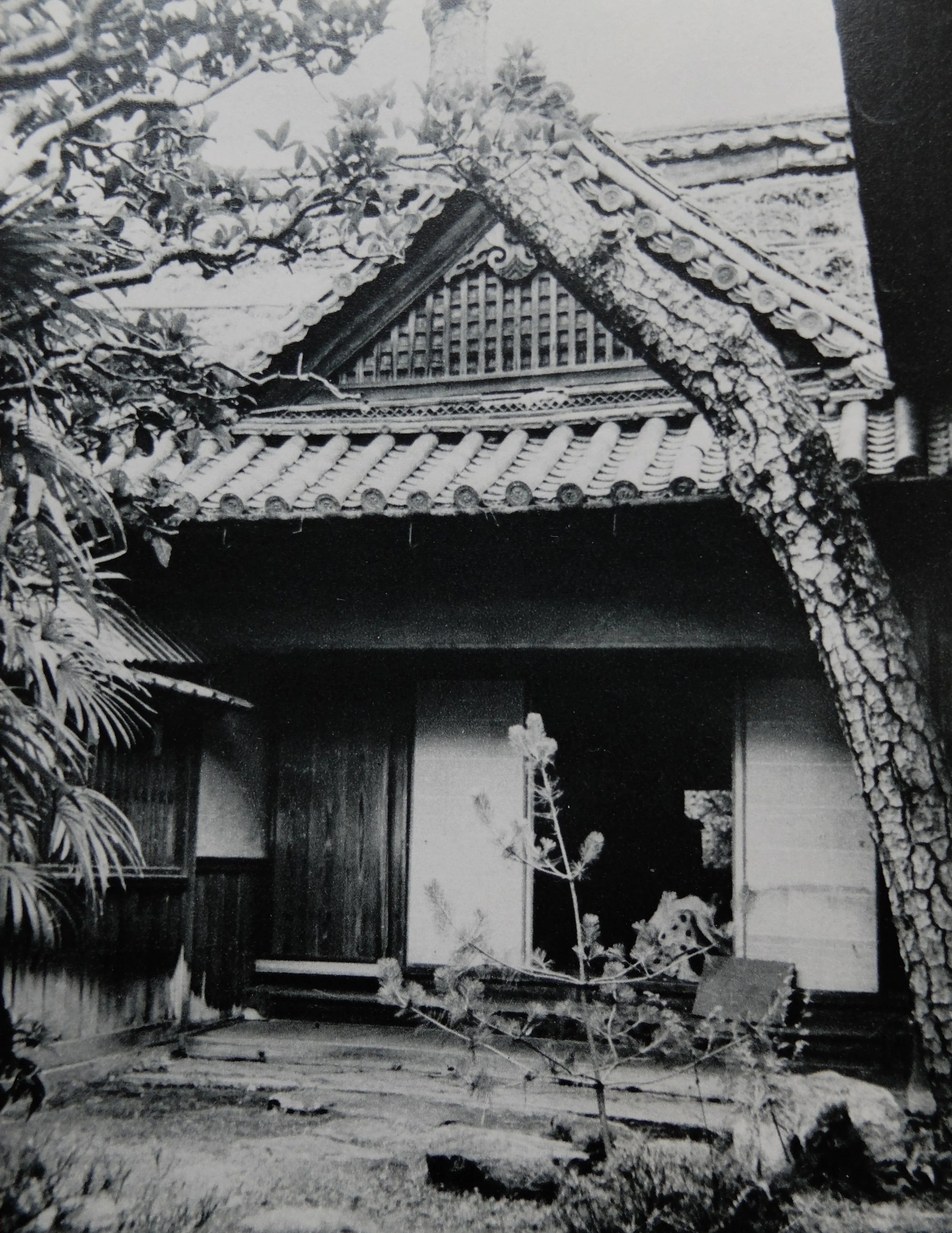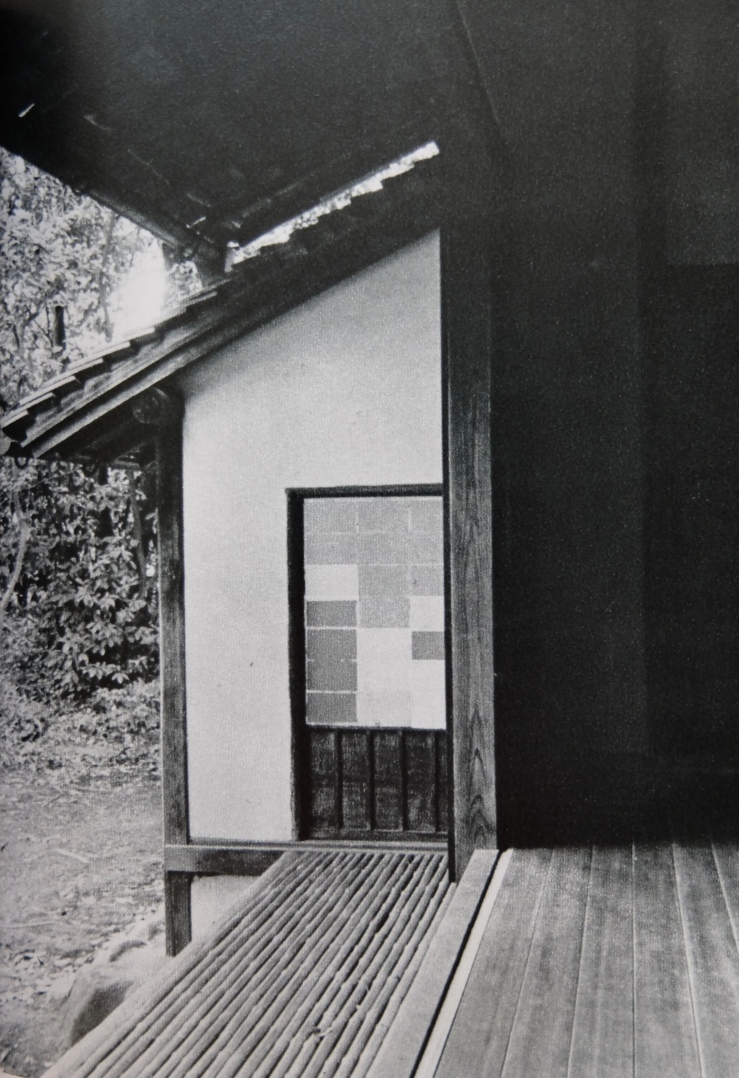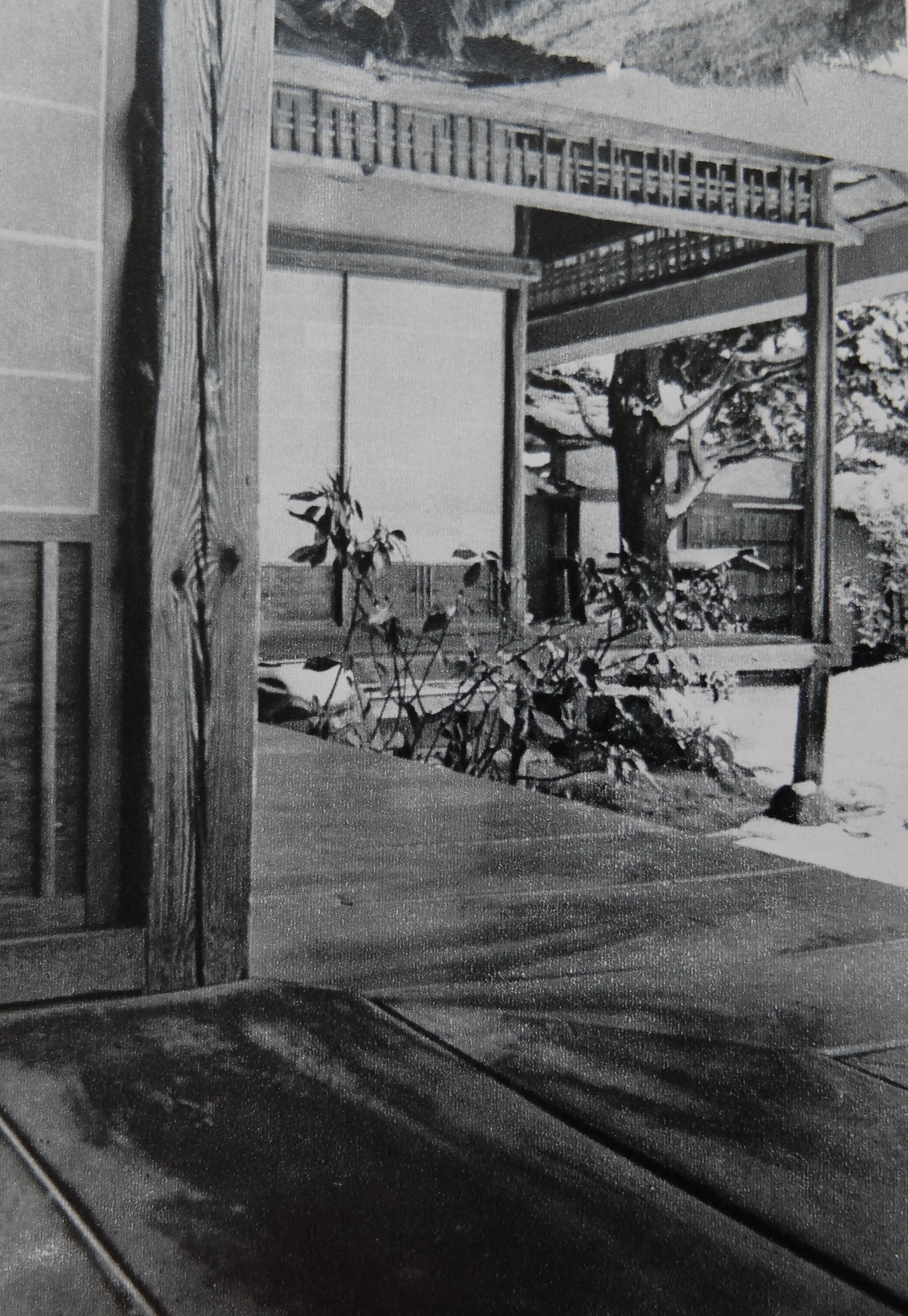 The image below shows the façade organisation of a gable-entry (tsuma-iri 妻入り) farmhouse in the Nose (能勢) district, О̄saka Prefecture. The utilitarian entrance door (о̄-do 大戸) is on the left, and to its right is the formal genkan entrance, with board floor (shiki-dai 式台), opaque timber lattice panels (maira-do 舞良戸) and papered timber lattice sliding panels (shо̄ji 障子). To the right of the genkan, extending perpendicularly out from the facade, are the garden wall and garden gate (niwa-chūmon 庭中門), on the other side of which is the guest room (kami-zashiki 上座敷) which faces onto the garden (tei-en 庭園). This arrangement is representative of mid-scale farmhouses (chū-nо̄-ka 中農家) in the Kinki region.