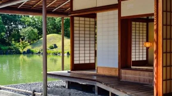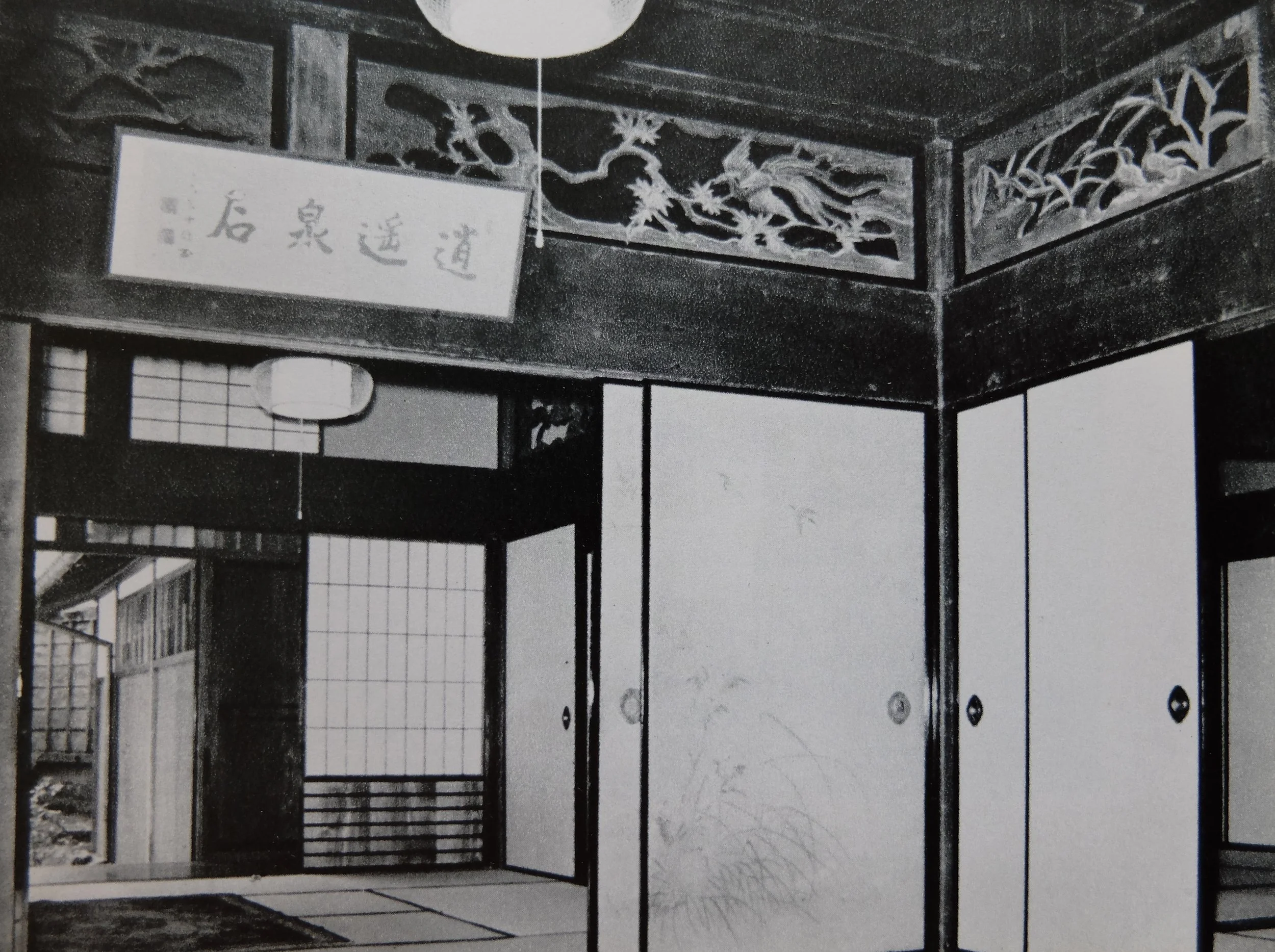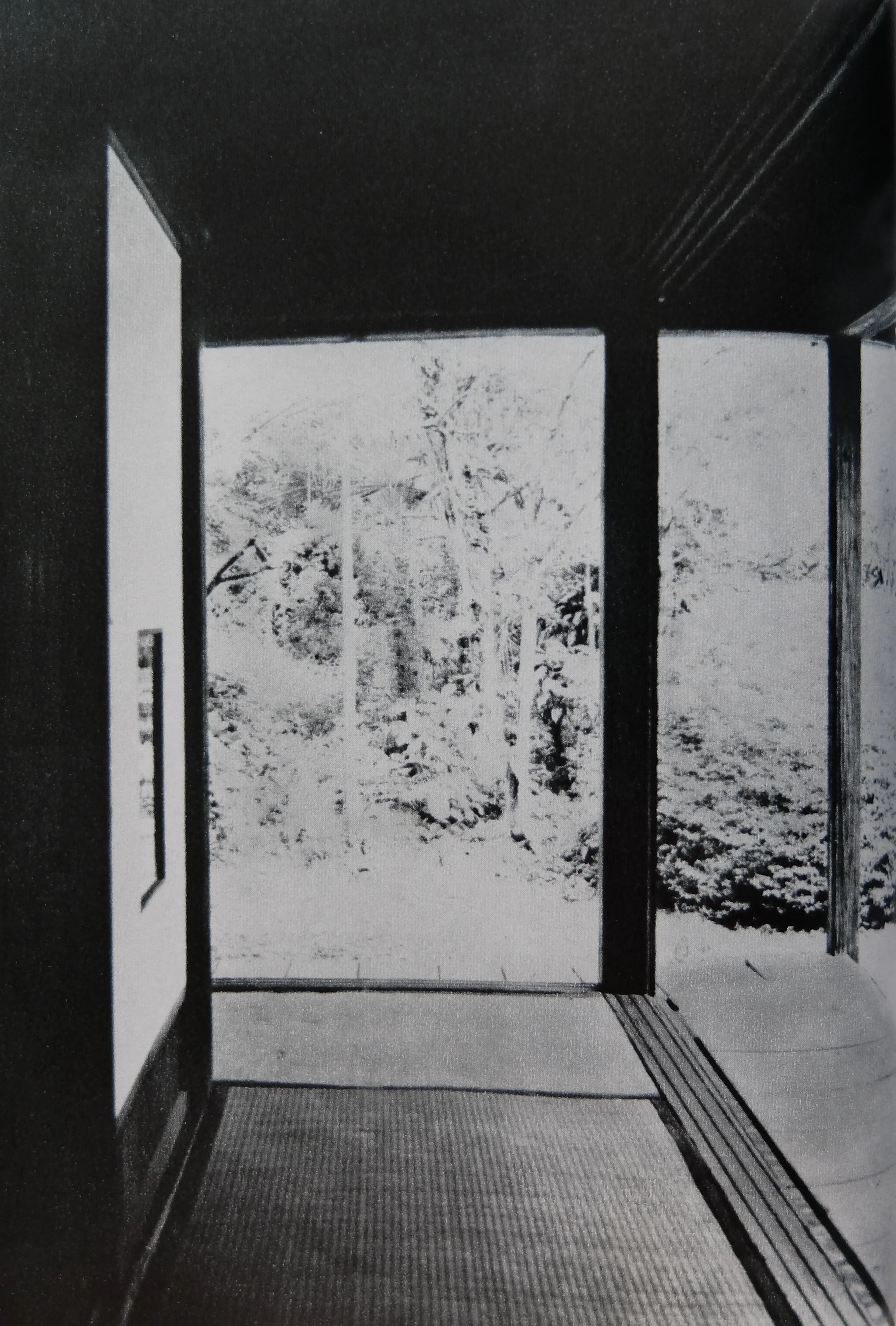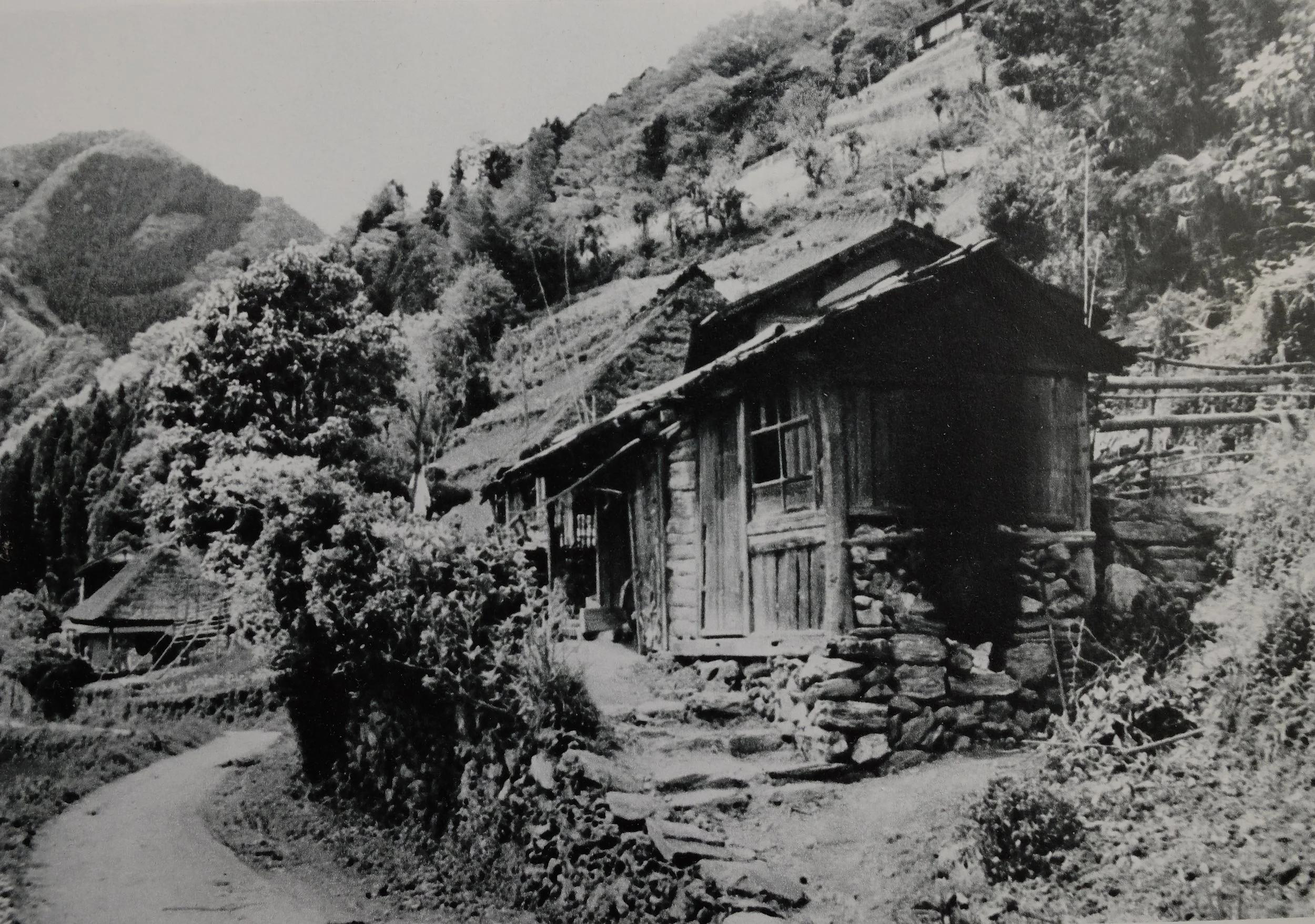 The image below shows the façade organisation of a gable-entry (tsuma-iri 妻入り) farmhouse in the Nose (能勢) district, О̄saka Prefecture. The utilitarian entrance door (о̄-do 大戸) is on the left, and to its right is the formal genkan entrance, with board floor (shiki-dai 式台), opaque timber lattice panels (maira-do 舞良戸) and papered timber lattice sliding panels (shо̄ji 障子). To the right of the genkan, extending perpendicularly out from the facade, are the garden wall and garden gate (niwa-chūmon 庭中門), on the other side of which is the guest room (kami-zashiki 上座敷) which faces onto the garden (tei-en 庭園). This arrangement is representative of mid-scale farmhouses (chū-nо̄-ka 中農家) in the Kinki region.