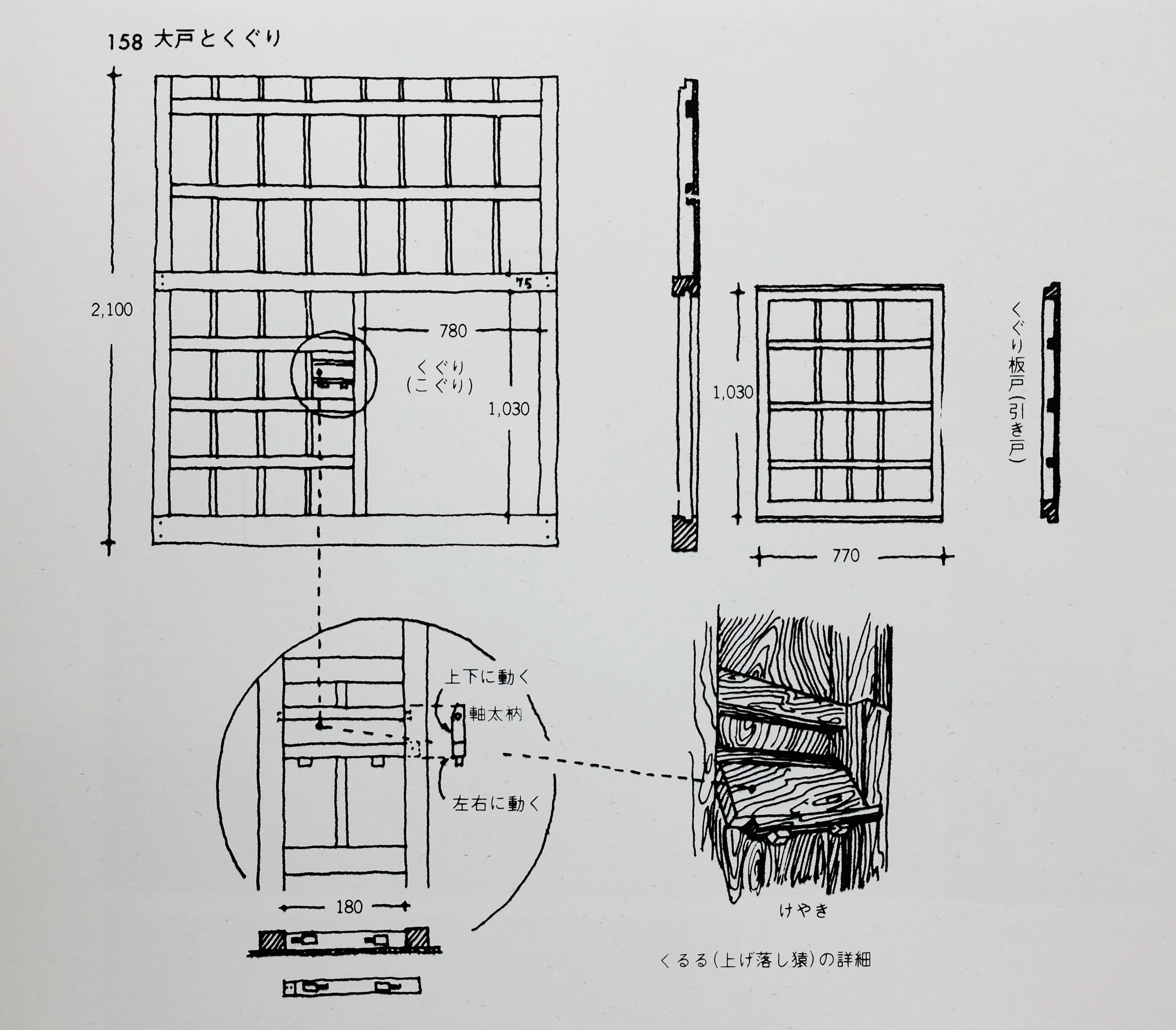 Detail (shо̄sai 詳細) drawings of an о̄-do (大戸) and moguri with a simple but secure door locking (to-jimari 戸締り) mechanism. Here the sliding (hiki-do 引き戸) boarded (ita-do 板戸) moguri is called the kuguri-itado (くぐり板戸), kuguri (くぐり), or koguri (こぐり). The lock itself is called the kururu (くるる) or age-otoshi-saru (上げ落し猿, ‘raise drop monkey’) and is made from zelkova (keyaki けやき, Zelkova serrata), a hardwood. The kururu consists of two operable parts: a timber block or ‘latch’, 18cm long, and a timber ‘bolt’ of the same length. The block is top-hinged to, and fits exactly between, two vertical members of the о̄-do. When the block hangs vertically, it is recessed into the о̄-do so that the kuguri can slide freely past it into the open position. The bolt is connected to the bottom edge of the block by two timber pegs that run through longitudinal slots on the bolt, so that the bolt is restrained up-down but free to move laterally (left-right). To lock the door, the kuguri is closed, and the bottom of the block is swung up so that it obstructs the path of the moguri, with its right edge in contact with the side of the moguri’s left vertical frame member or ‘stile’. To prevent the block from falling back to its vertical ‘open’ position when let go of, the bolt is slid across to the right so it rests against the face of the moguri’s left stile. Arai family (Arai-ke 新井家) residence, Tо̄kyо̄ Prefecture.