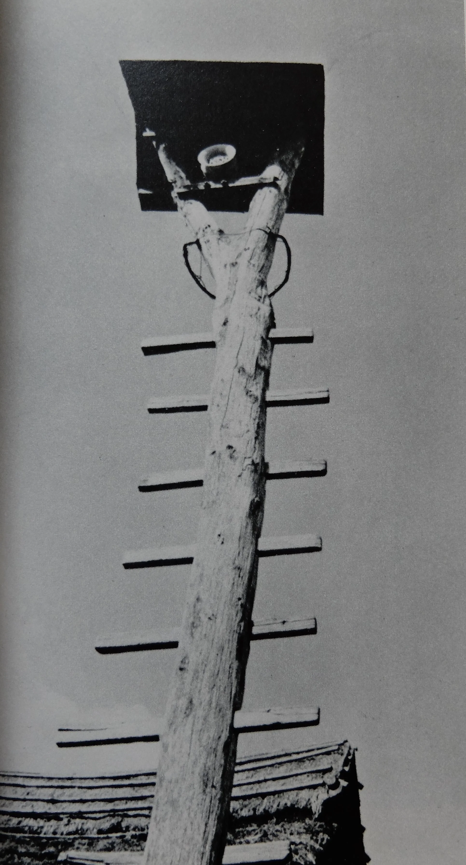 An Ainu notched-log one-pole ladder called a nikara (二カラ), leading up into a raised-floor storehouse ( プー). Hokkaidо̄ Prefecture.