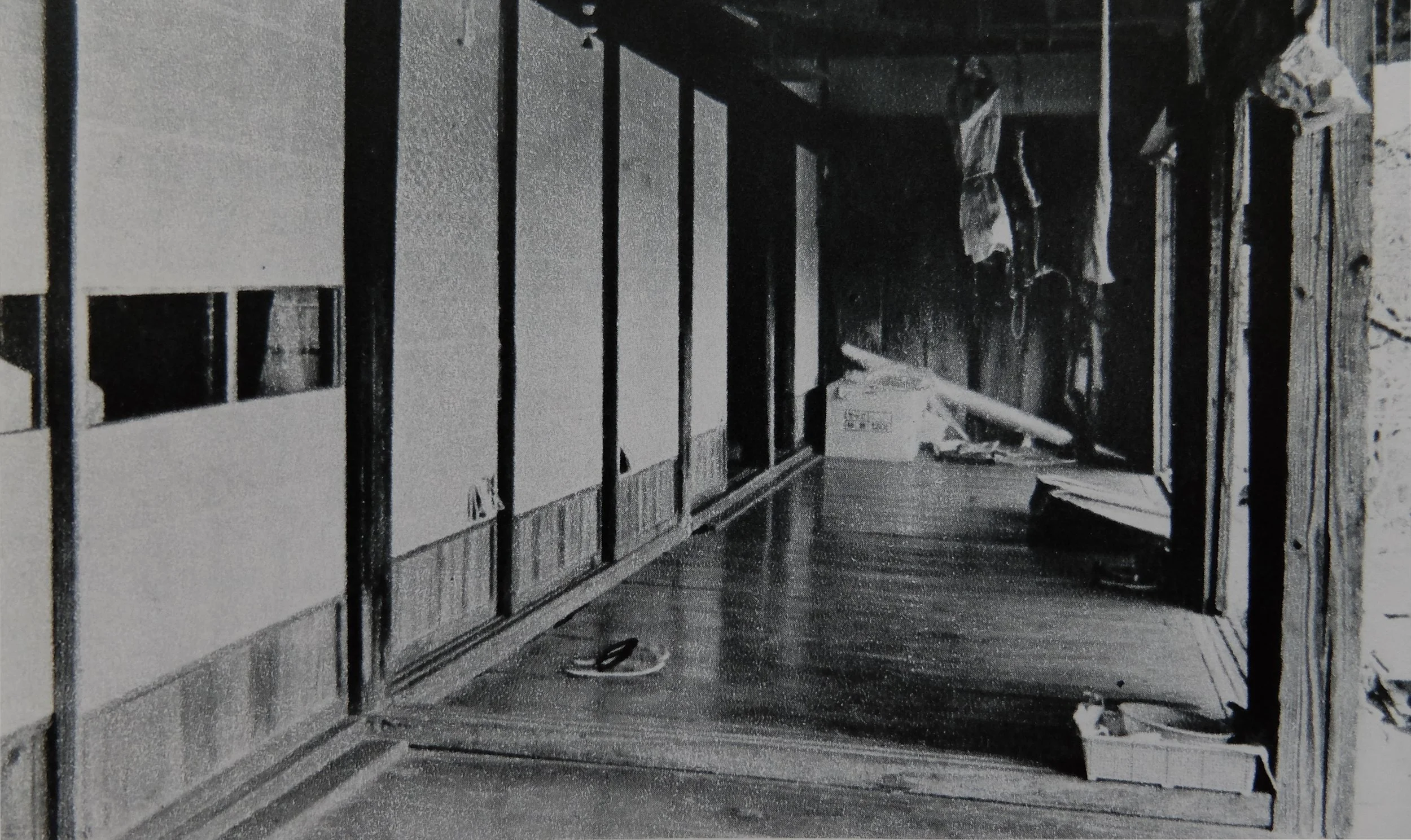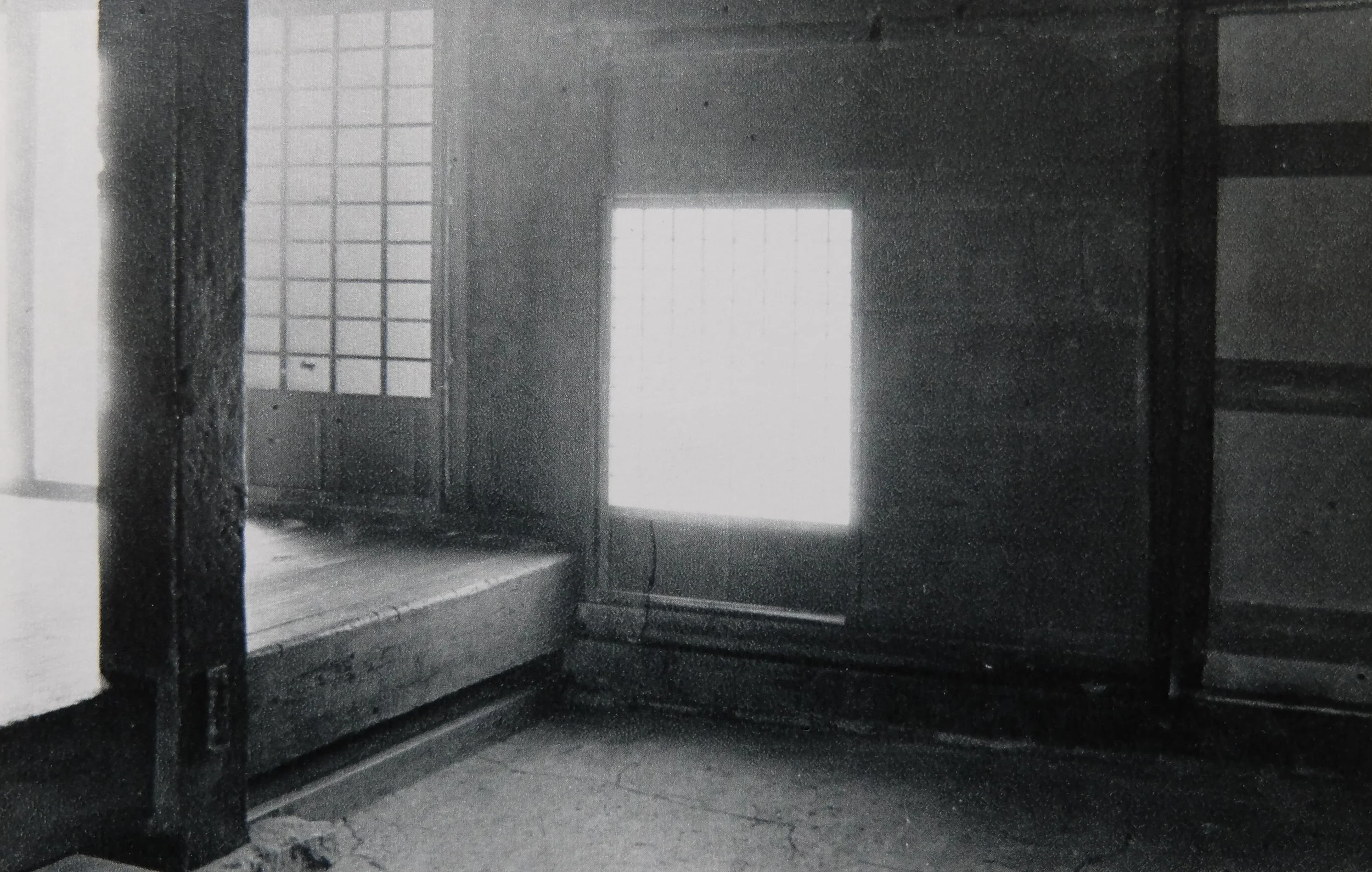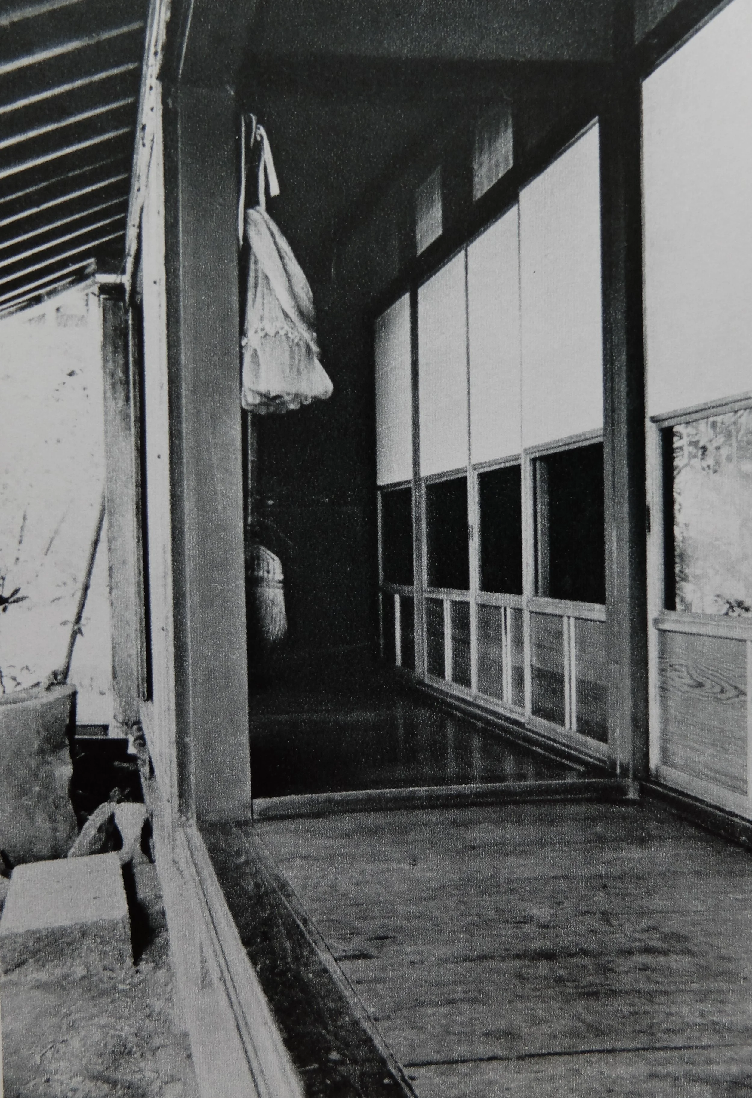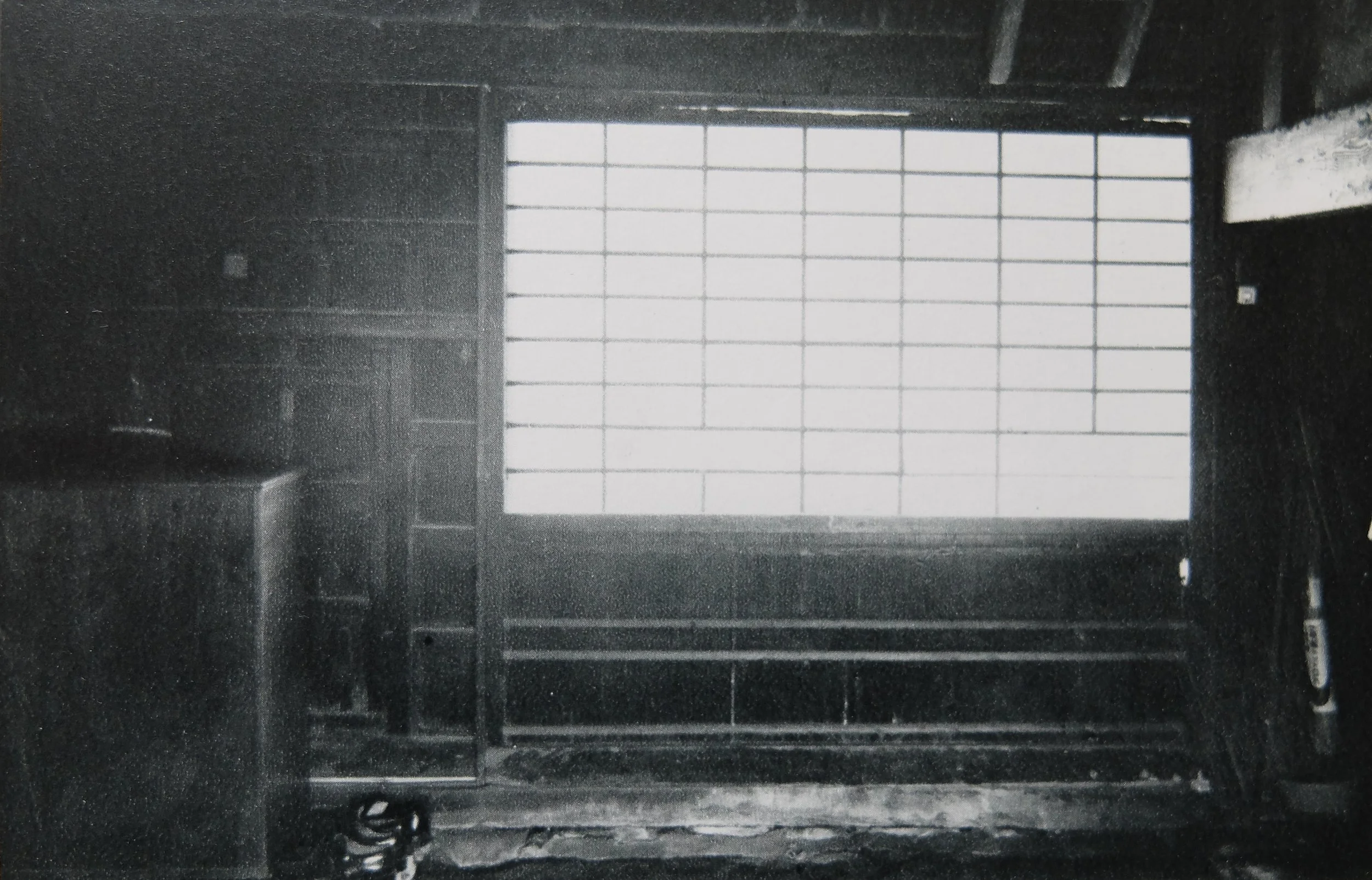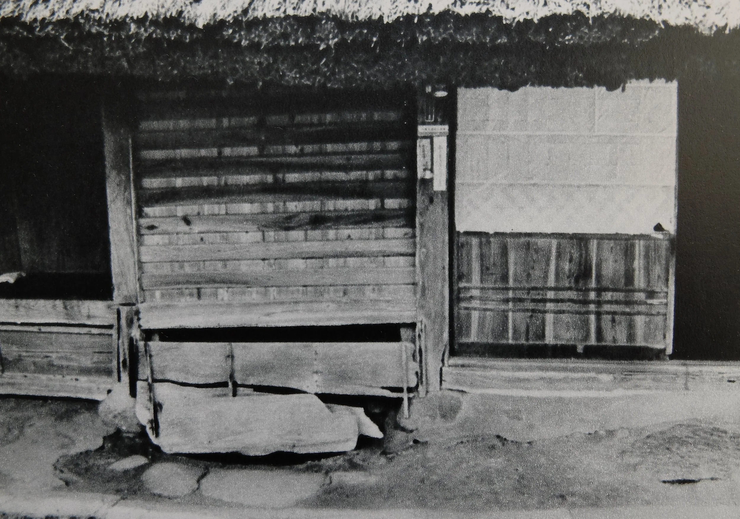 An о̄-do-guchi (大戸口) entry during the day, with a single sliding ‘waisted shо̄ji’ (koshi-shо̄ji 腰障子) panel one ken (間) wide, or around 1.8m, over the opening. О̄saka Prefecture.
