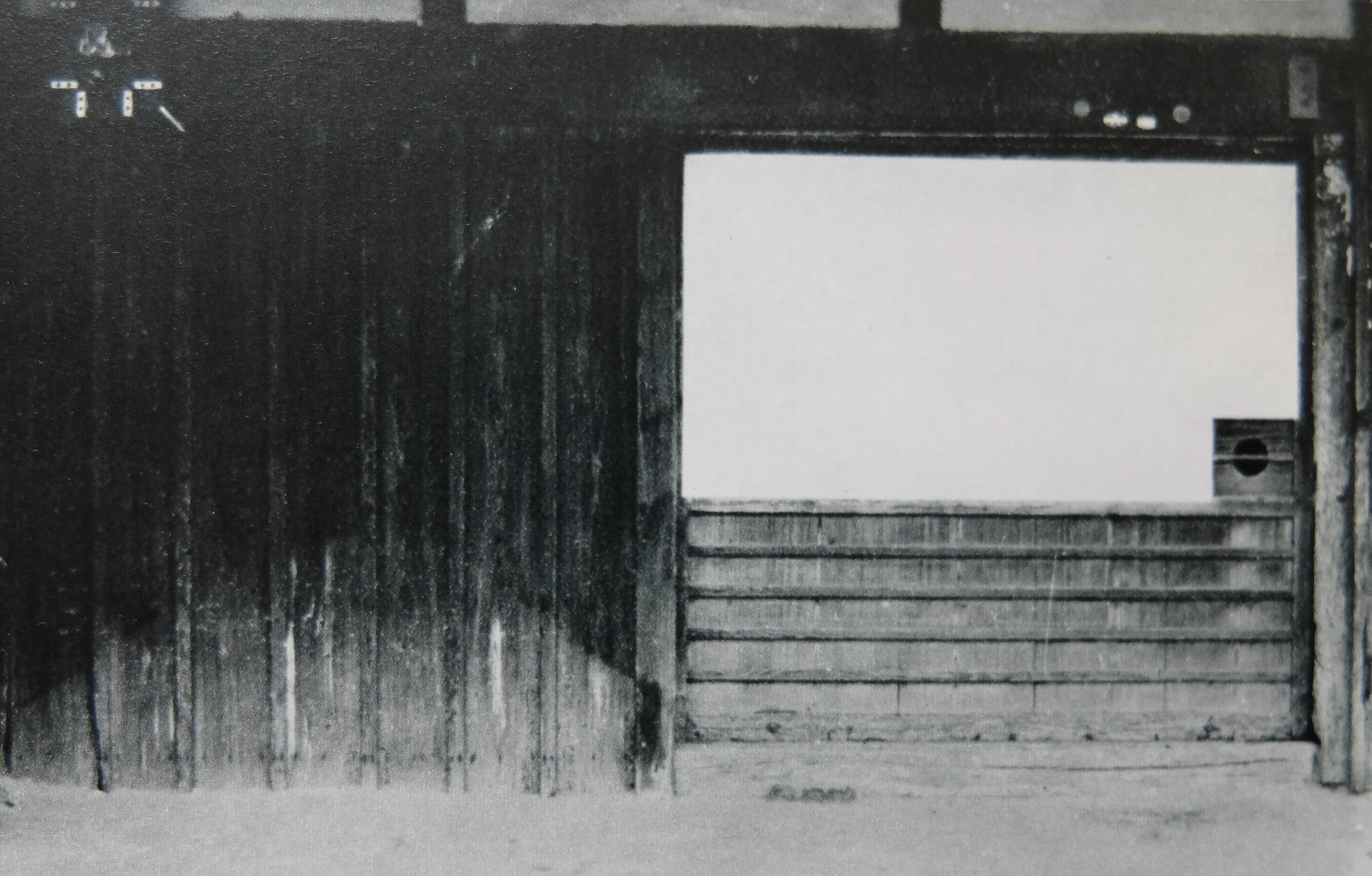 An о̄-do-guchi (大戸口) entry, similar in arrangement to that in the previous image, seen from the interior side. Drawn back to the left is the о̄-do (大戸), with moguri-do (潜り戸), for use at night. Nara Prefecture.