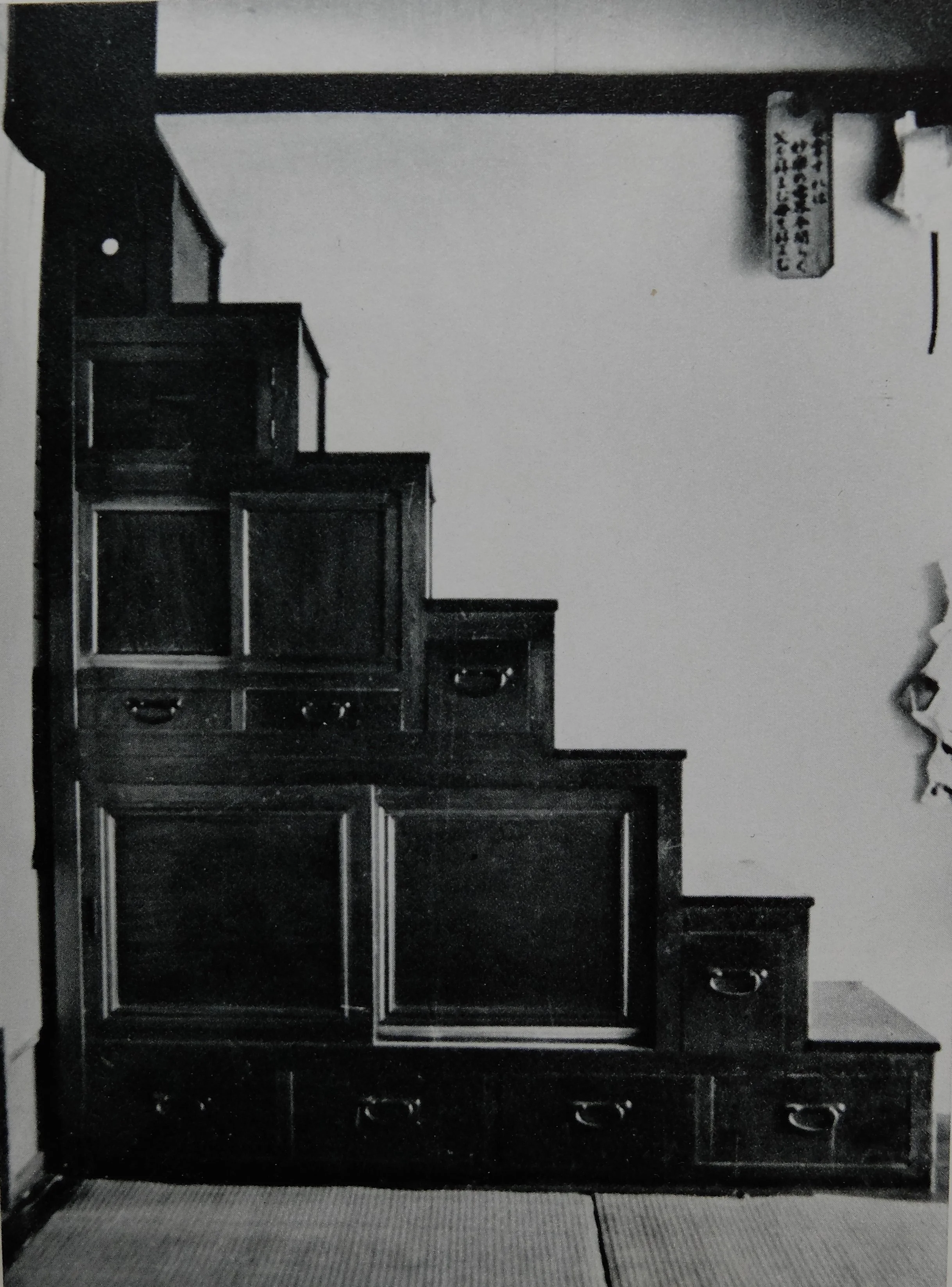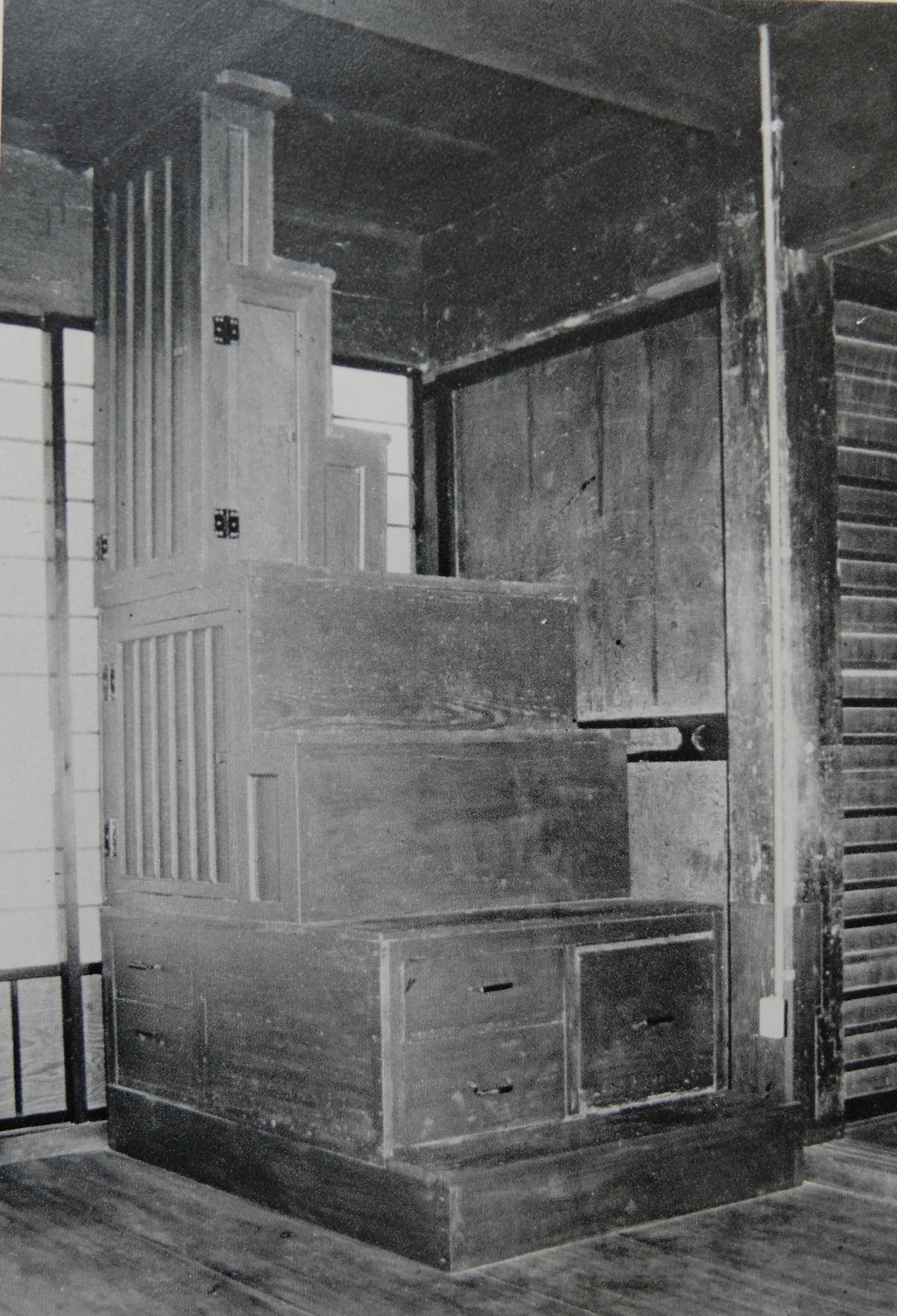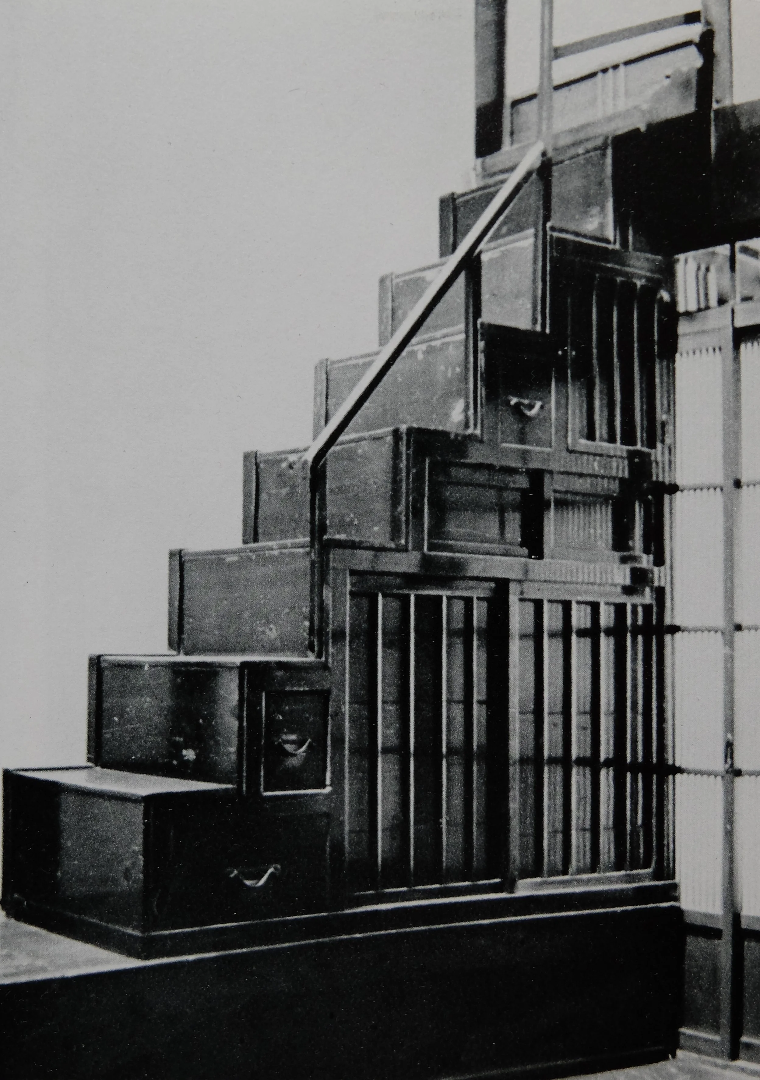 The furniture-style ‘box stair’ (hako-dan 箱段), a common sight in and around Kyо̄to, in which drawers (hiki-dashi 抽出し) and storage cupboards (mono-iri to-dana 物入り戸棚) are built in under the treads. О̄ta family (О̄ta-ke 太田家) residence, Shiga Prefecture.