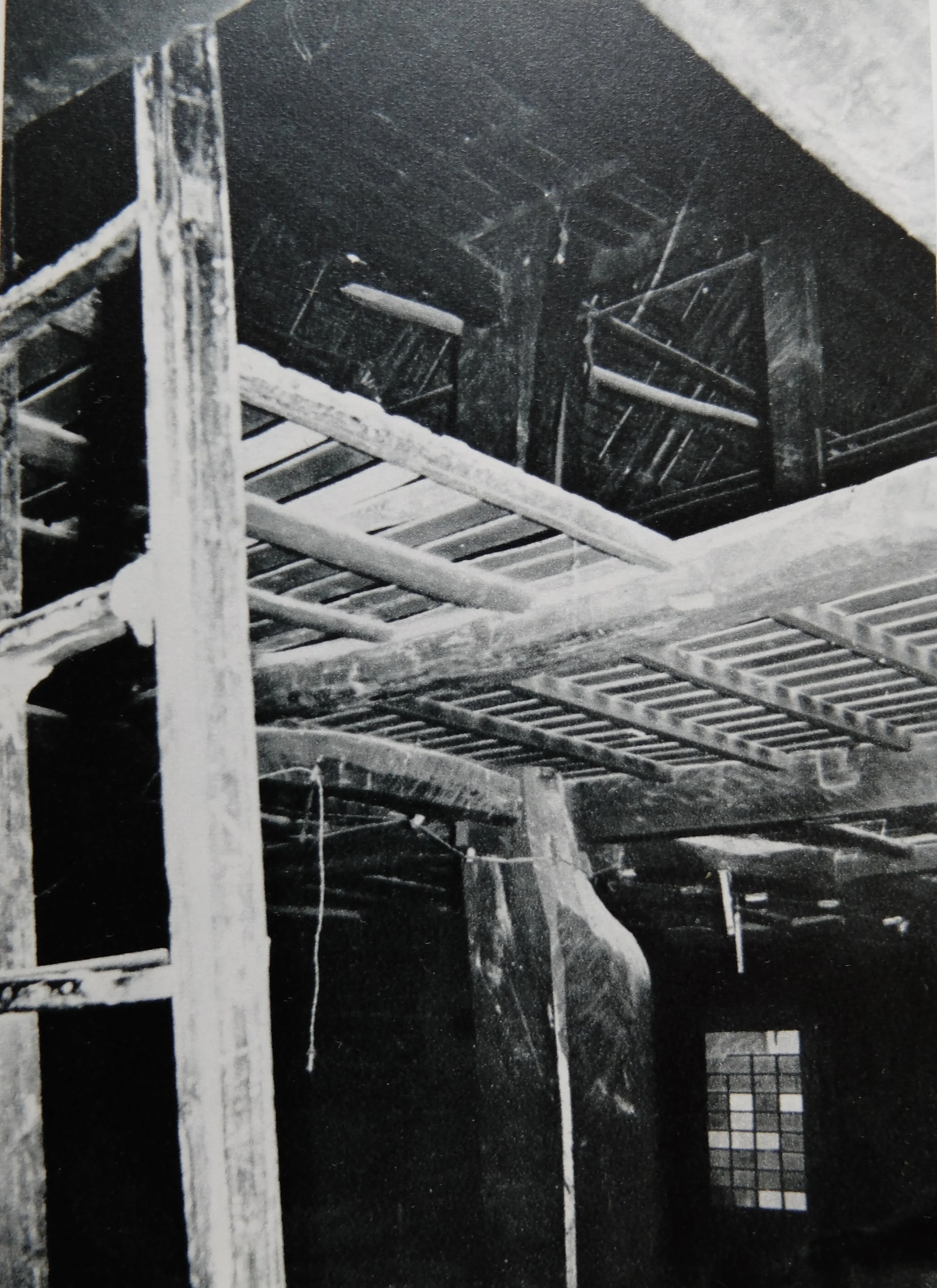 The kiri-hafu tsukuri roof space consists of multiple levels, called wanike (わにけ); the through-posts (udatsu-bashira) and the massive main post (daikoku-bashira 大黒柱) rise up through these floors to the ridge. Yamagata Prefecture.