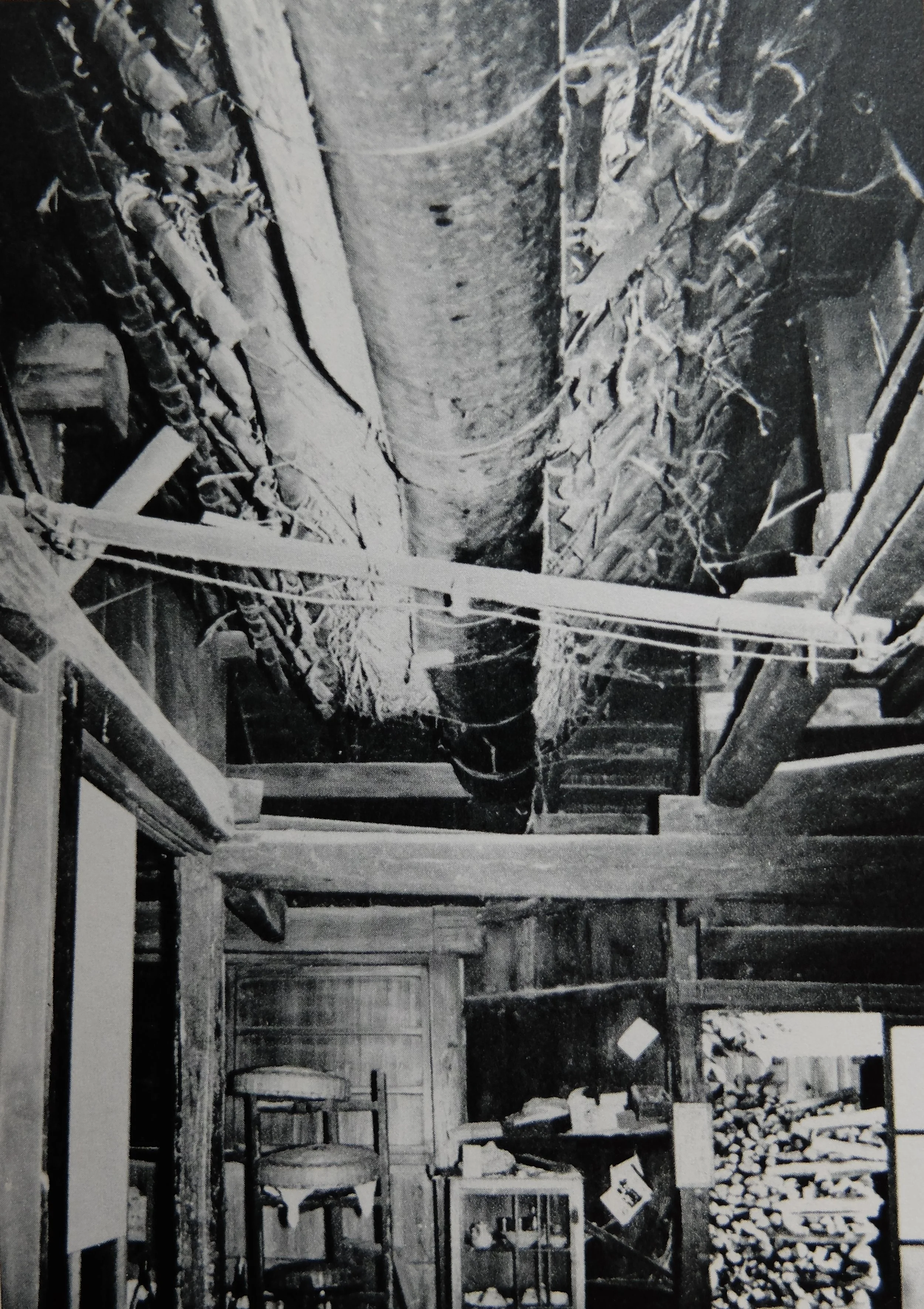 The ‘cookhouse’ (kama-ya 釜屋) doma is of the ‘passage niwa’ (niwa is an alternative name for doma) or tо̄ri-niwa type (tо̄ri-niwa-shiki 通り庭式), with an entry doma (iri-guchi doma 入口土間) on the façade side adjacent to the raised-floor part, and the stove (kudo 竈) installed to its rear; on the ‘outer’ (shimo-te 下手) side of the doma part are the stable (umaya 厩), and to its rear a food storage area (shokuryо̄ chozо̄ no mono-oki 食糧貯蔵の物置き) corresponding to a ‘miso room’ (miso no heya 味噌部屋). The area where the omo-ya and kama-ya meet is around one ken (around 1.8m) in width and is unified and continuous with the rest of the doma; over it, an internal gutter (uchi-doi 内樋) runs from front to back. As seen in the interior photograph shown below, the gutter is supported by connecting beams (tsunagi-bari 繋ぎ梁) that span between the posts of the two structures. In the past, these gutters were constructed of hollowed-out logs or large-section bamboo, but more recently many were of steel sheet manufacture.