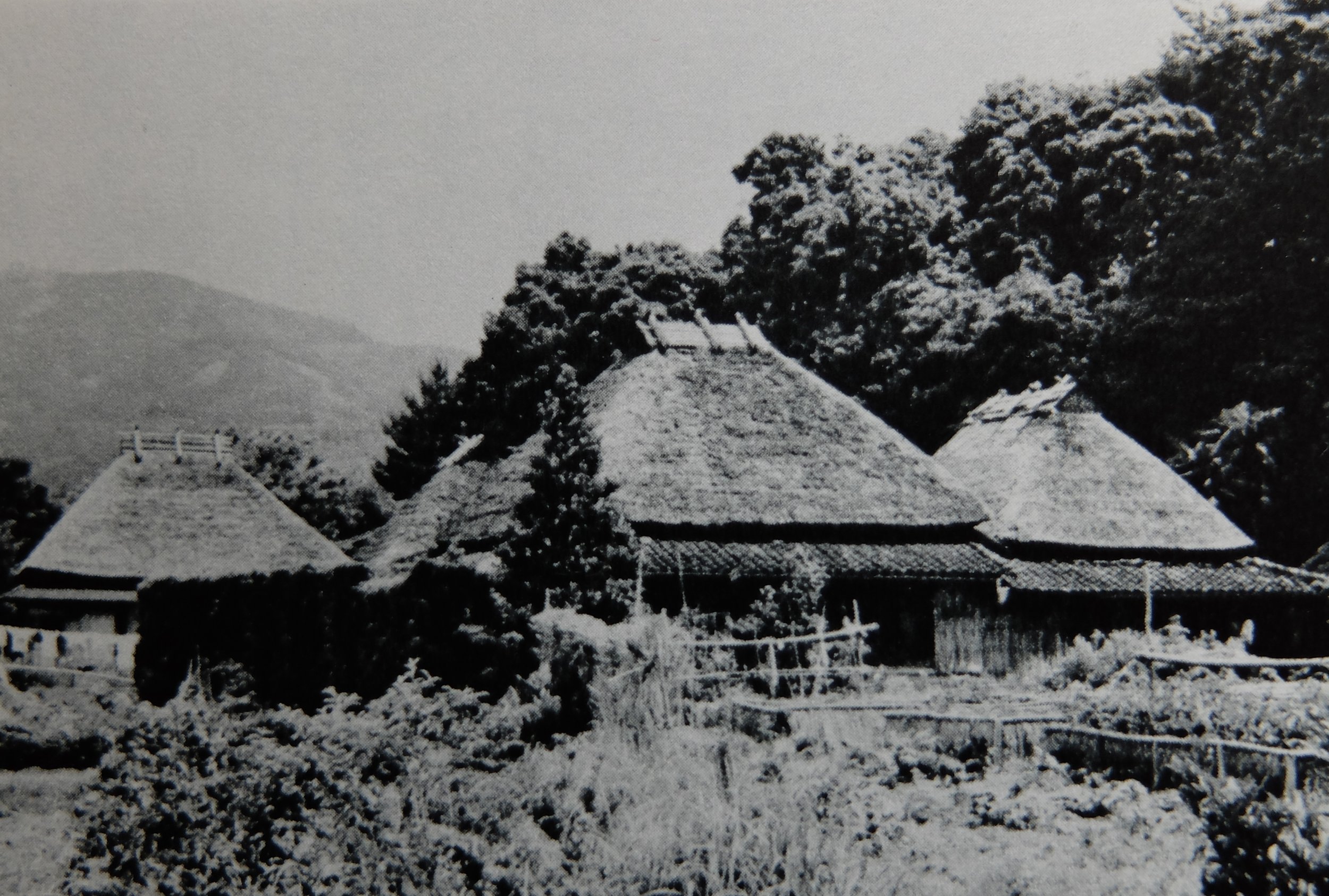 Scene of a village showing an ensemble of several near-identical shumoku-tsukuri minka. The shumoku-tsukuri of this district take a form in which the tiled eave (kawara-bisashi 瓦庇) of the omo-ya and the roof of the kama-ya are in contact. Shinshiro City (Shinshiro-shi 新城市), Aichi Prefecture.