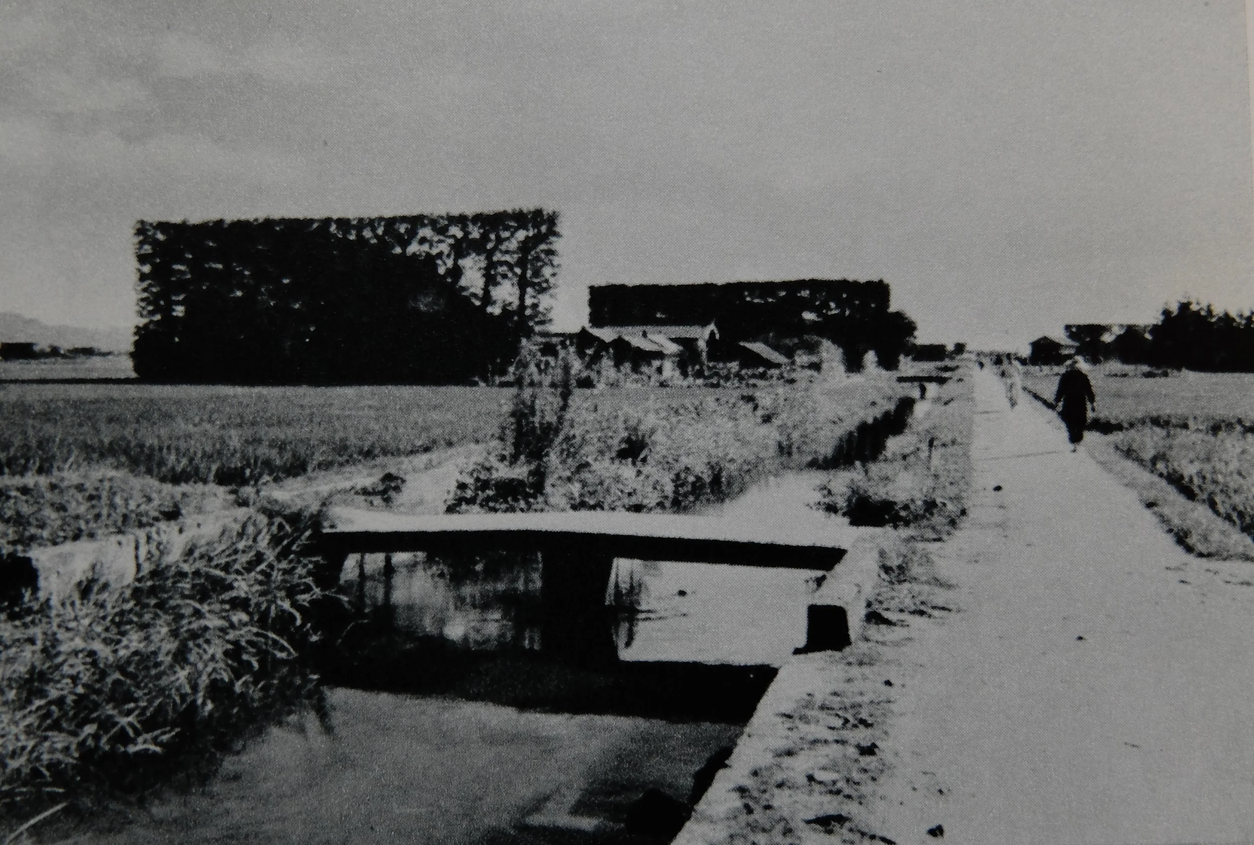 Windbreaks (bо̄fū-rin 防風林) called tsuiji-matsu (築 地 松) were developed to block the strong westerlies that blow across the Izumo Plain (Izumo Heiya 出雲平野), a rift belt (chikо̄-tai 地溝帯) between the Shimane Peninsula, which long ago was an island, and the ‘mainland’ (hondo 本土). The neatly clipped tsuiji-matsu of the ‘dispersed settlements’ (sanson 散村) were a unique landscape feature of the plain, and also the sole source of firewood for their minka. Shimane Prefecture. 風物