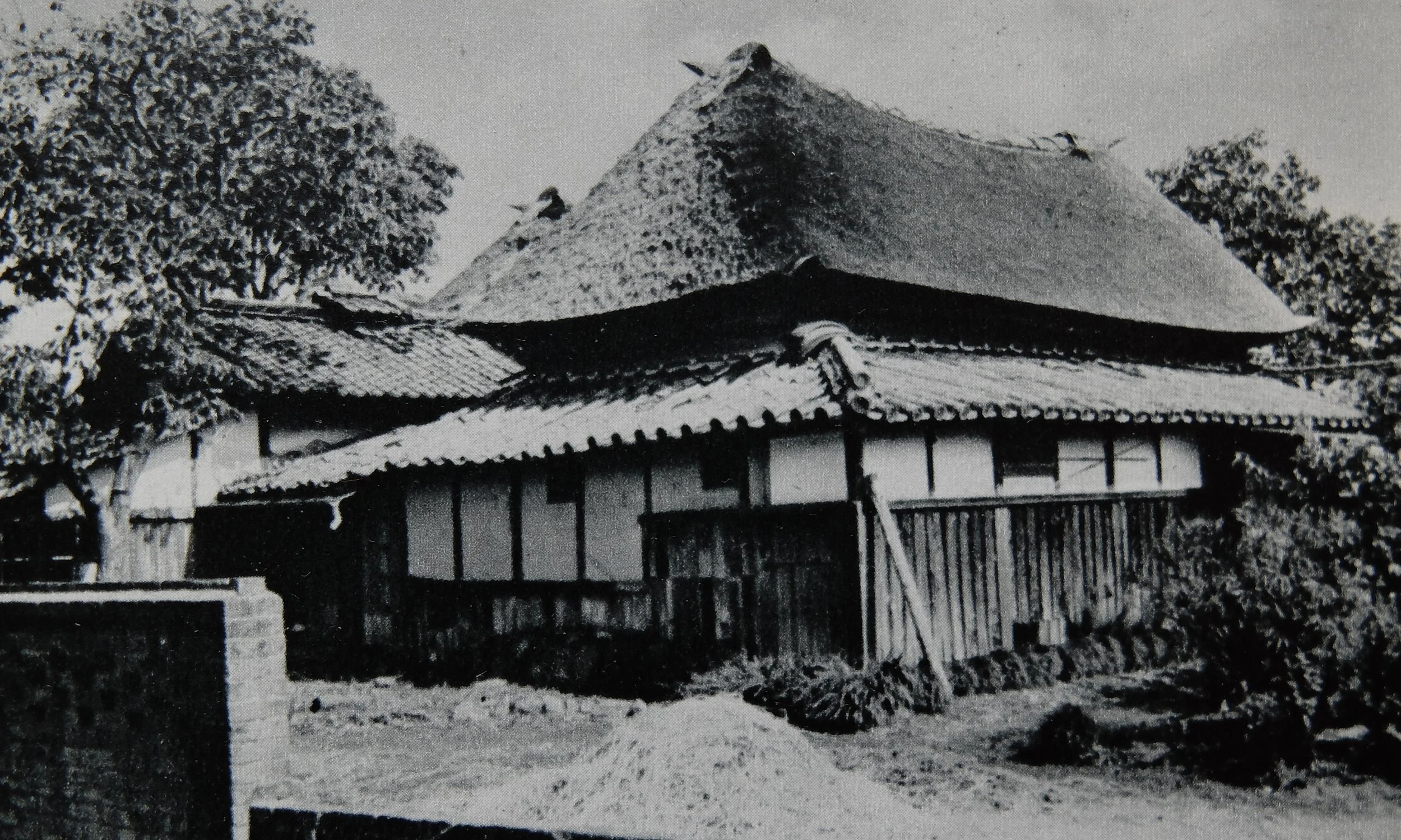 An о̄-ji-gata (凹字型) minka seen from the rear; showing the tiled ridge, lower tiled roof, and the projecting members called min-no-su (みんのす) and shigi-saki (しぎさき, ‘shigi tip’). Saga Prefecture.
