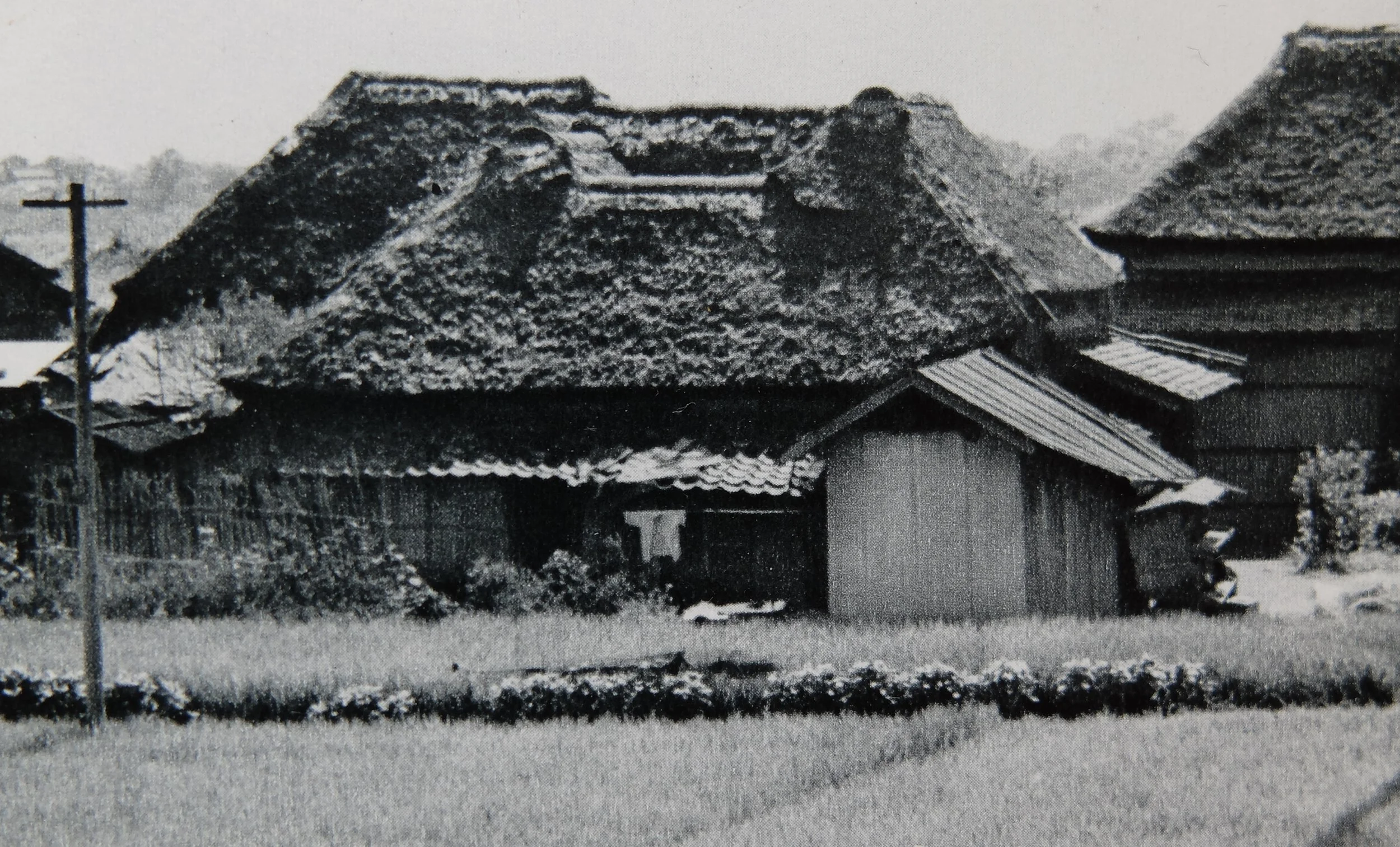 The minka found across the plains of Tsukushi are called kagi-ya-zukuri or kagi-ie-zukuri (鍵家造り, lit. ‘key house style’). Their plans are rectangular (kukei 矩型) layouts that can be found anywhere, but their roof ridges (yane-mune 屋根棟) describe an L (eru-gata L型) or U (yū-gata U型) form, and these minka present a unique external appearance. The thatched (kusa-buki 草葺き) roofs can also be found in other, more complex variations, and these too are designated by a letter of the alphabet or katakana character that best resembles them in plan: yu-gata (ユ型), ro-gata (ロ型), yo-gata (ヨ型), T-gata (T型), and so on. The parts of the dwelling not covered by these thatched roofs is covered by tiled (kawara-buki 瓦葺き), shallow-pitched lean-to roofs. Along the famous scenic sea coast of Saga Prefecture there are particularly many yū-gata (U型), also known as о̄-gata (凹型), roofs, whose appearance when viewed from the rear (the leg or ‘prong’ side of the U) is reminiscent of a curved Japanese stove (kudo くど or kamado 釜土), hence the name kudo-zukuri (くど造り, ‘stove style’).