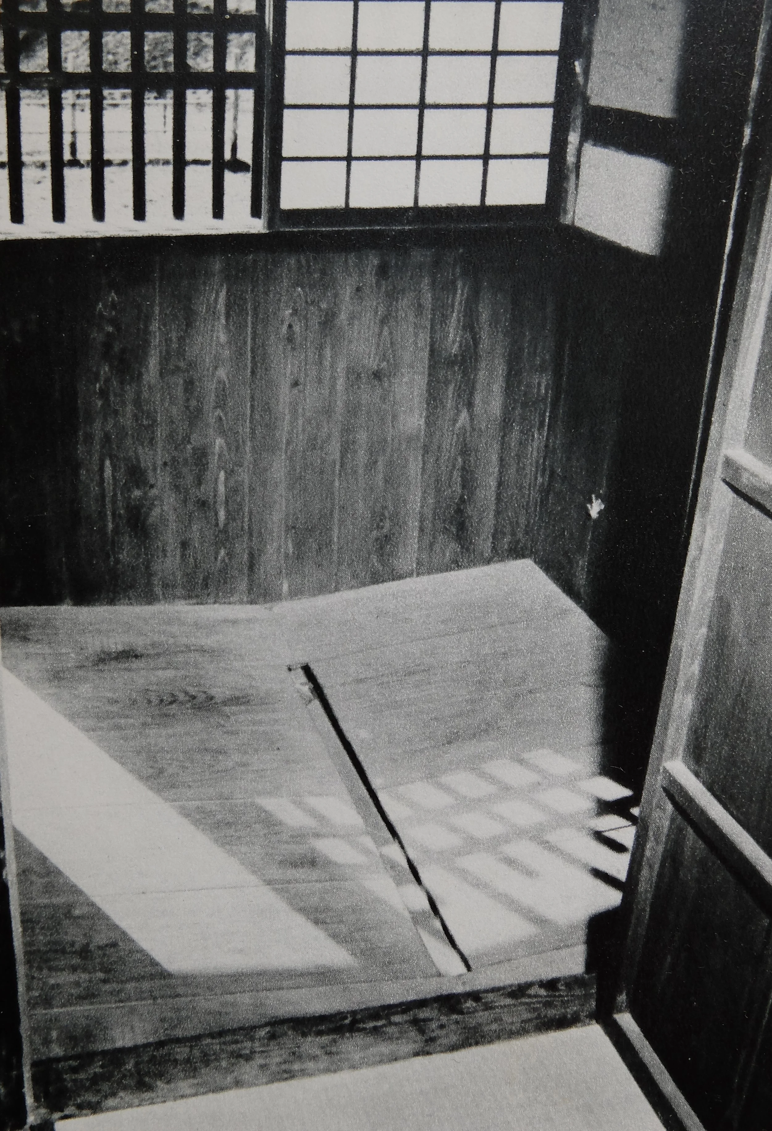 The yu-dono (湯殿, lit. ‘bathing hall’), the ‘bathroom’ (yoku-shitsu 浴室) built as a separate structure in the shinden-zukuri (寝殿造り) residential complexes of the nobility, was also a facility for heated water mokuyoku. This style of bathroom survived in minka, in the form like that seen in the image below. For the convenience of drainage, the floor boards are given a fall, but otherwise there are no fixtures or fittings.
