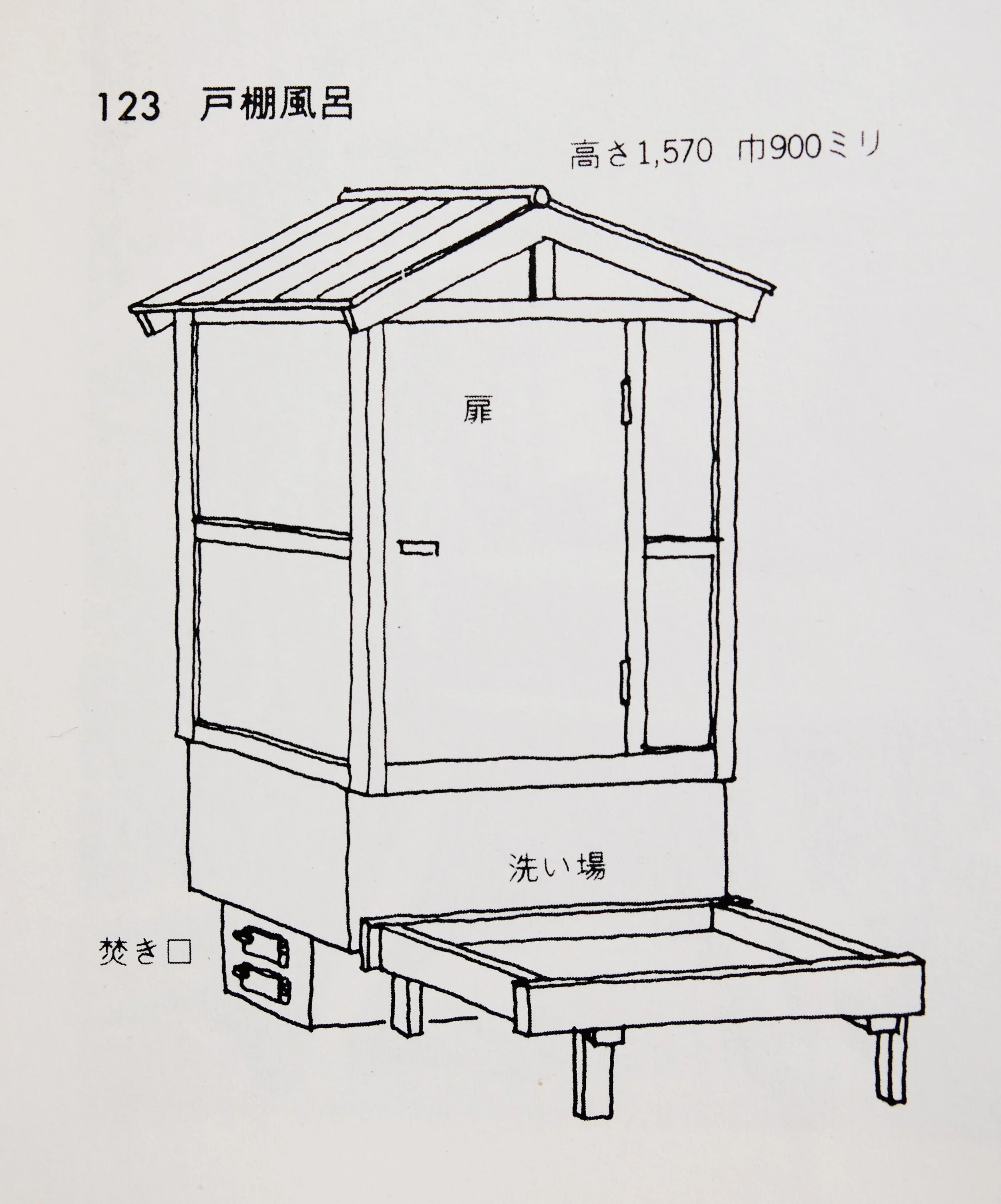 Illustration of an individual steam bath for private domestic use, the todana-buro (戸棚風呂, ‘cupboard bath’). Labelled are the door (to 戸), the ‘washing place’ (arai-ba 洗い場), and the firebox door (taki-guchi 焚き口).